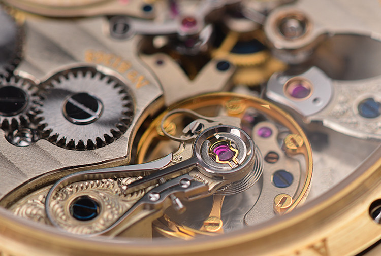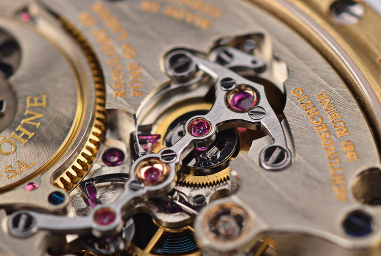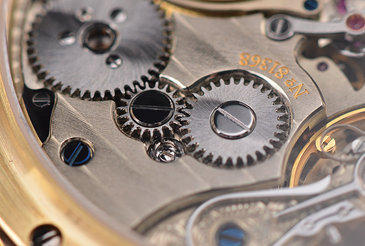 朗格的猫头鹰系列以核心跳字结构及发条盒闻名,在机芯的一侧,我们能够明显看到一个复杂的关键模组,位于发条盒边缘,该结构带有离合功能,当秒轮走过一圈(也即60秒)之后,就会触发该结构,瞬时完成两个重要过程,一个是推动分轮向前跳动一格,一个是发条盒瞬时给该部件的独立发条补充能量。这两个动作完成的非常迅速,以至于肉眼很难瞬时分辨,但实际上内部的缜密协调,已经完成了至少4组动作,当然每个动作几乎在同步进行,也同步完成,其精妙之处,匪夷所思。