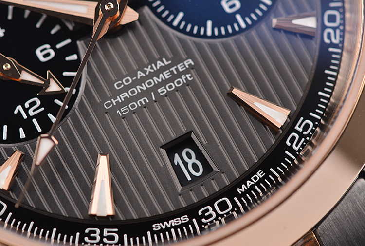 表盘:深棕色“柚木条纹”计时表盘,玫瑰金夜光刻度及指针,GMT两地时及日历显示