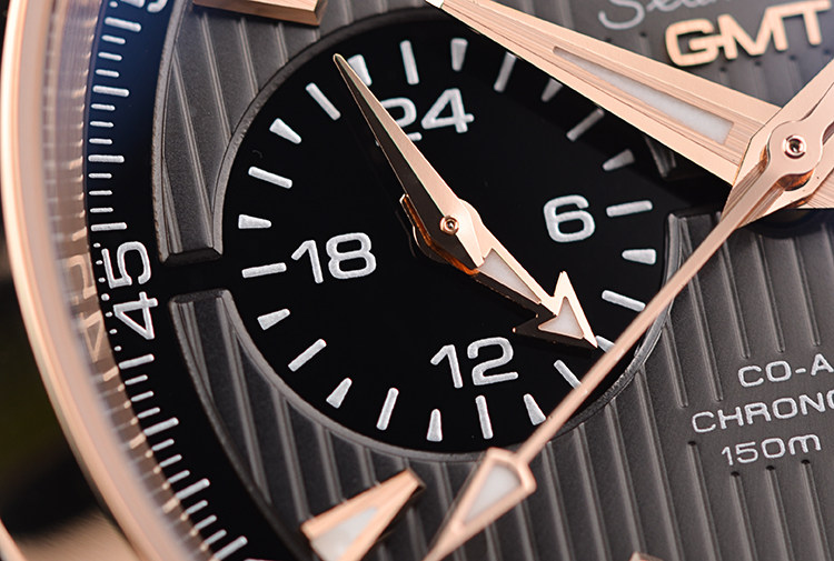 海马系列150米防水玫瑰金及钢GMT两地时计时日历自动机械男表