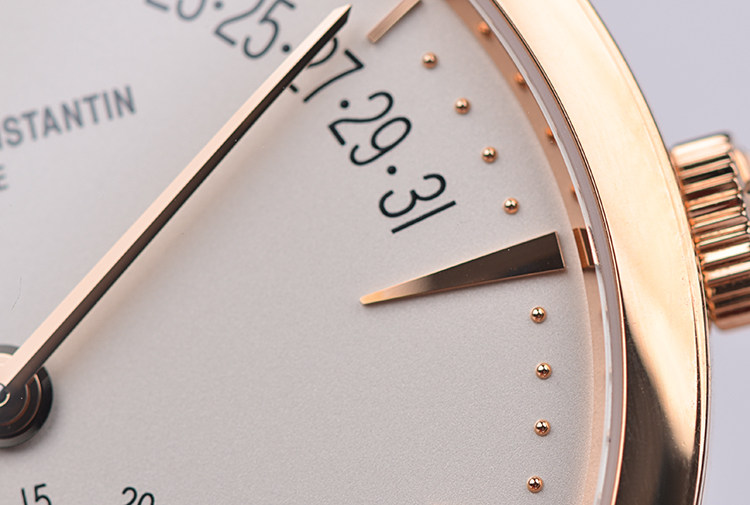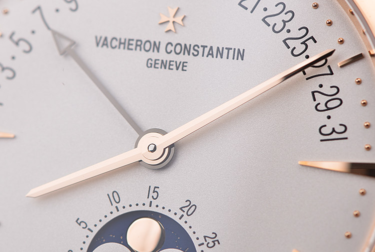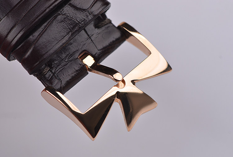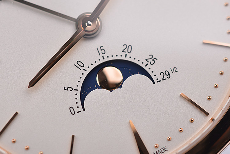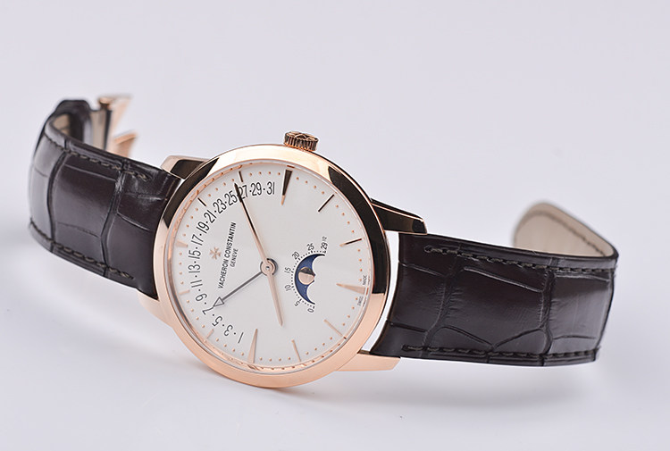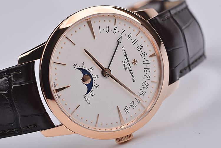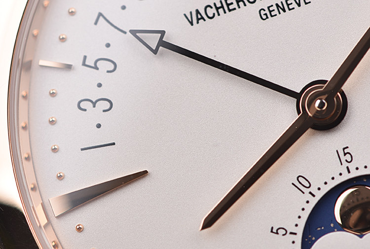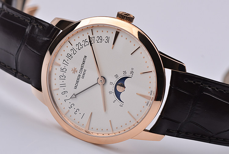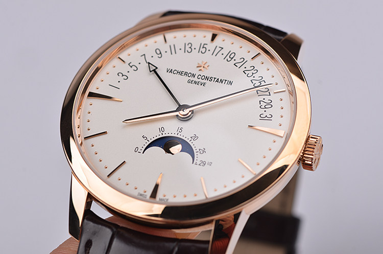 表盘:立体银白色表盘,玫瑰金刻度及指针,日历逆跳,月相显示