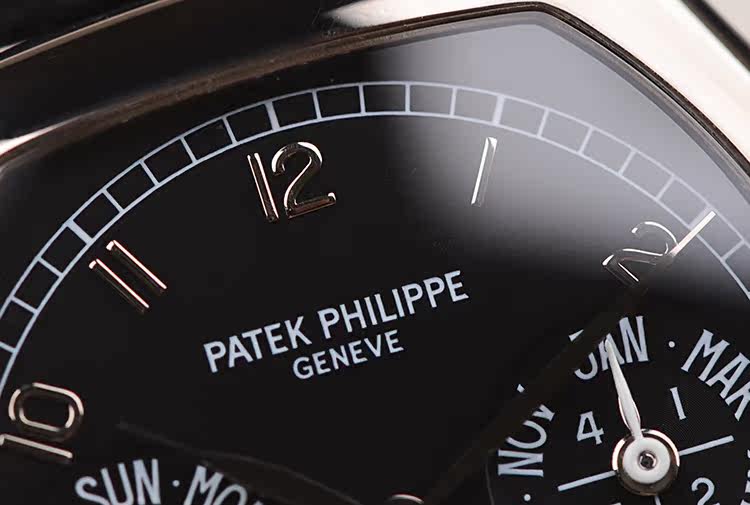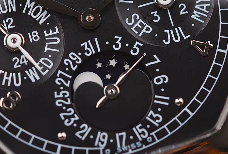 表盘:立体黑色万年历月相表盘,白金阿拉伯数字刻度及指针