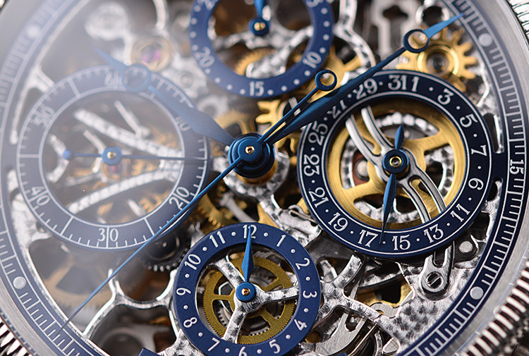 表盘:立体蓝色全镂空计时表盘,指针日历