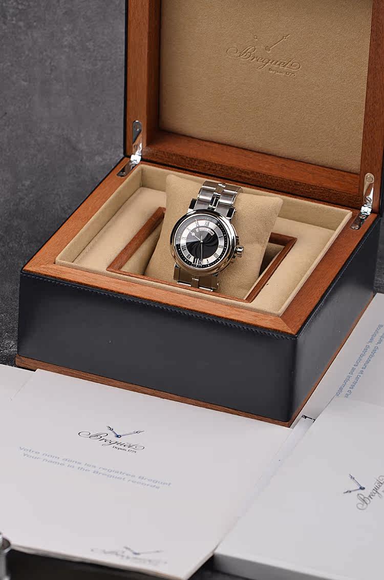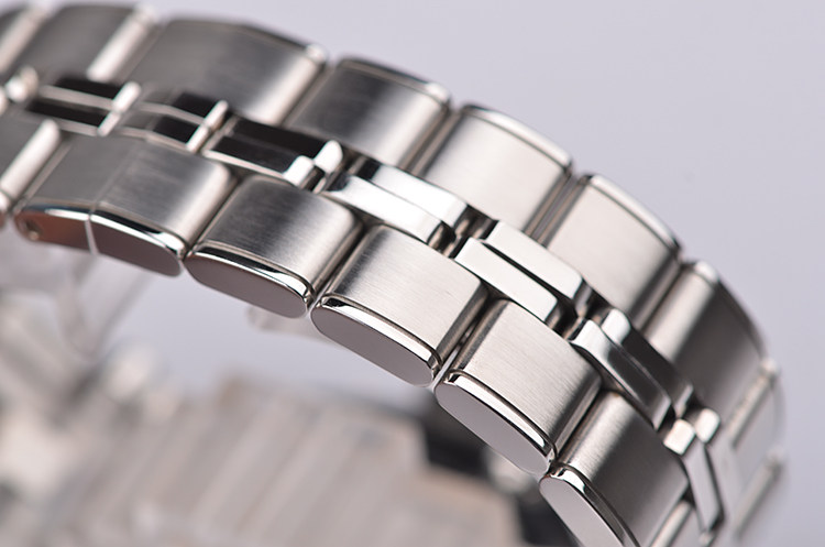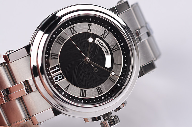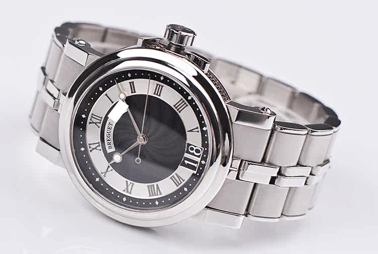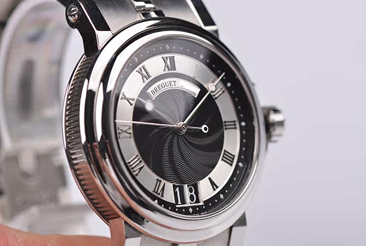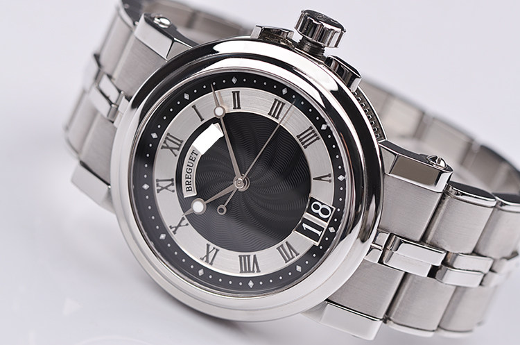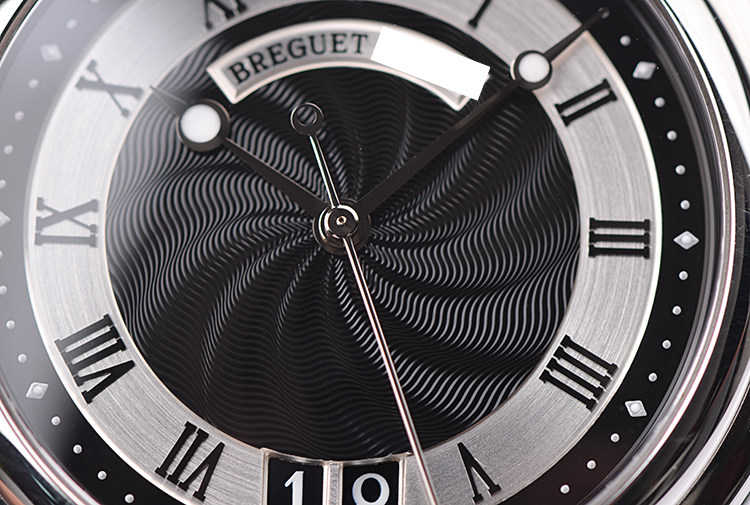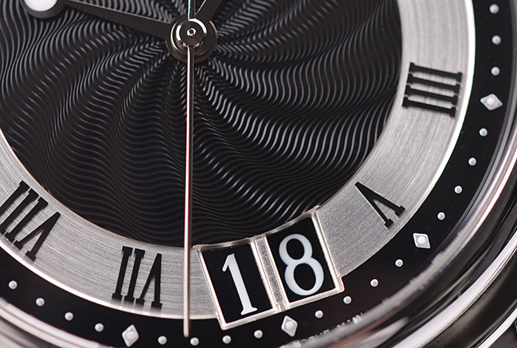 表盘:银黑双色白金镀银镌刻表盘,阿拉伯数字刻度,大日历视窗