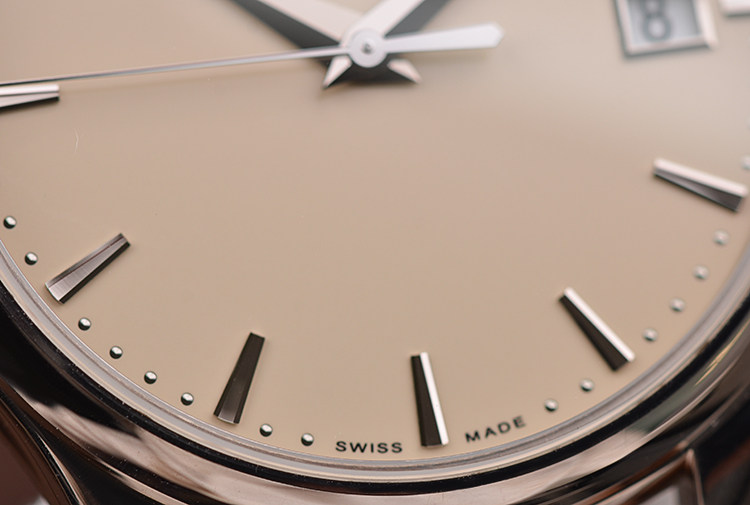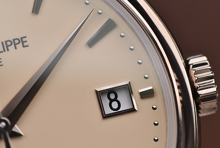 表盘:立体象牙白色表盘,白金刻度及指针,日历显示