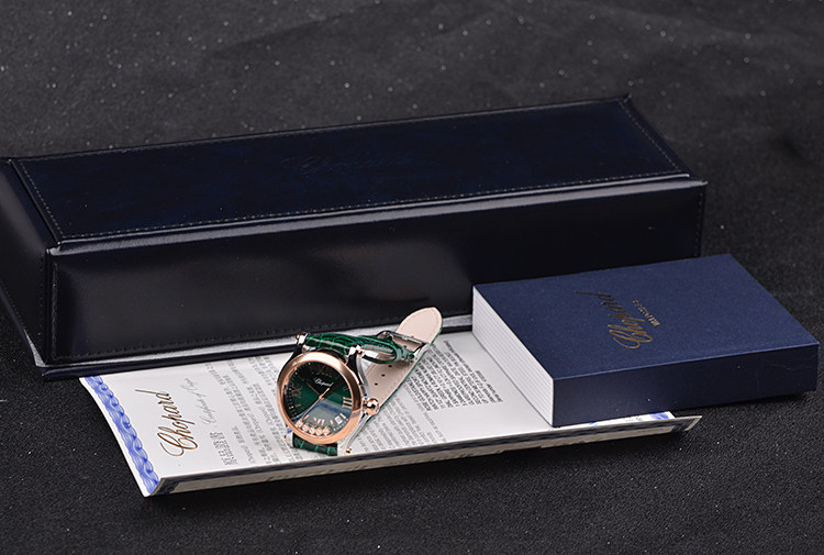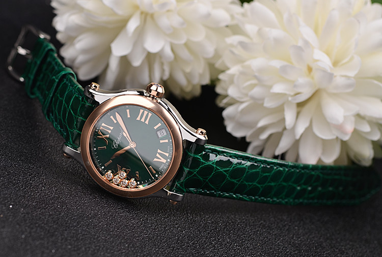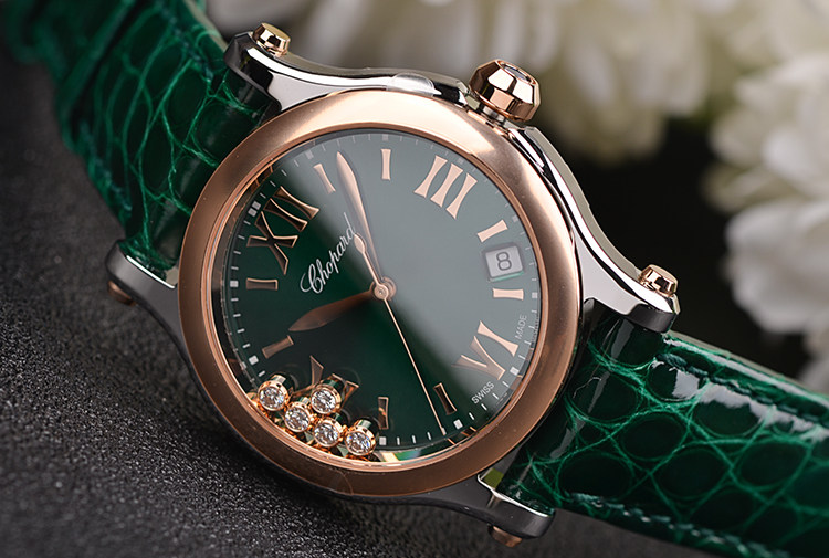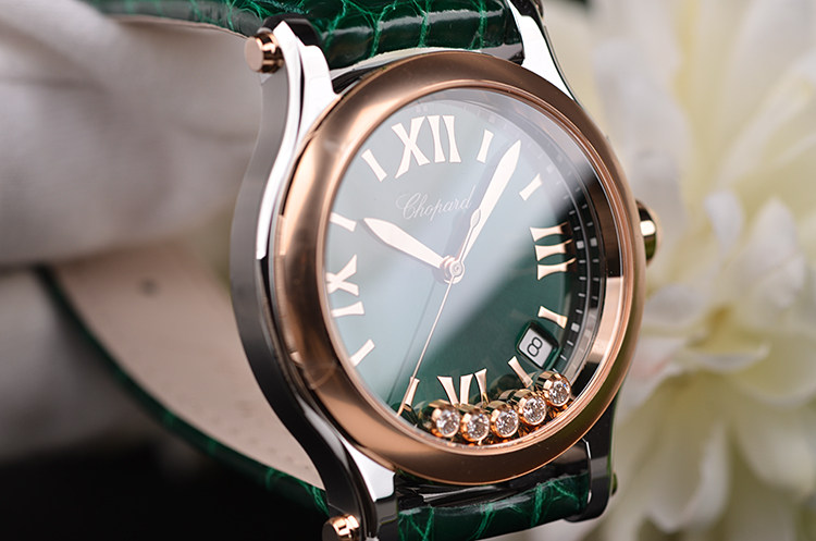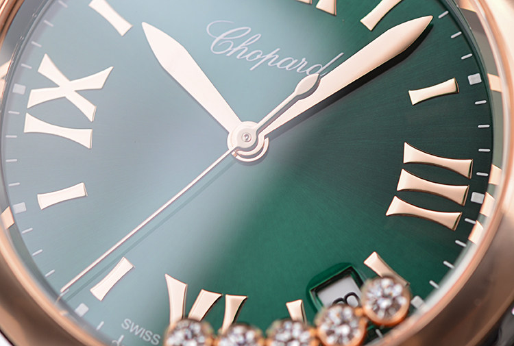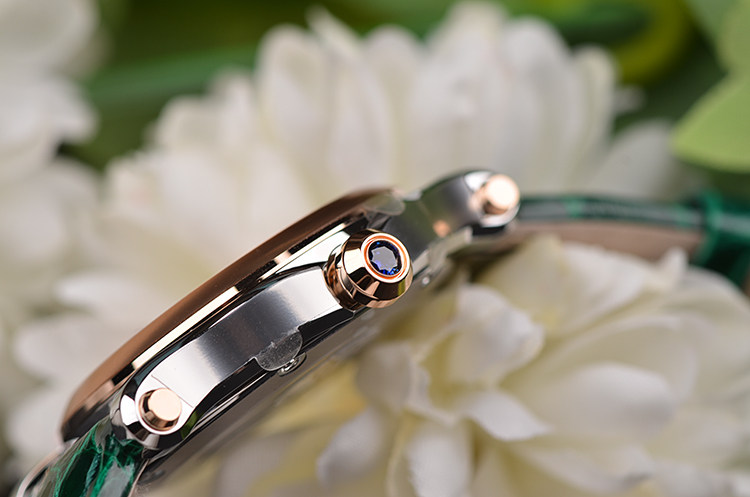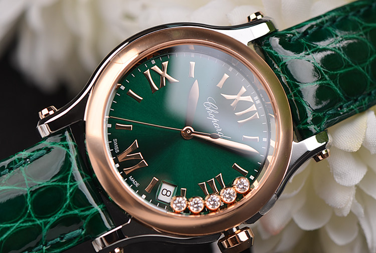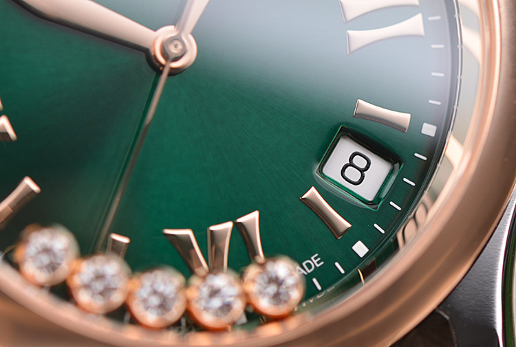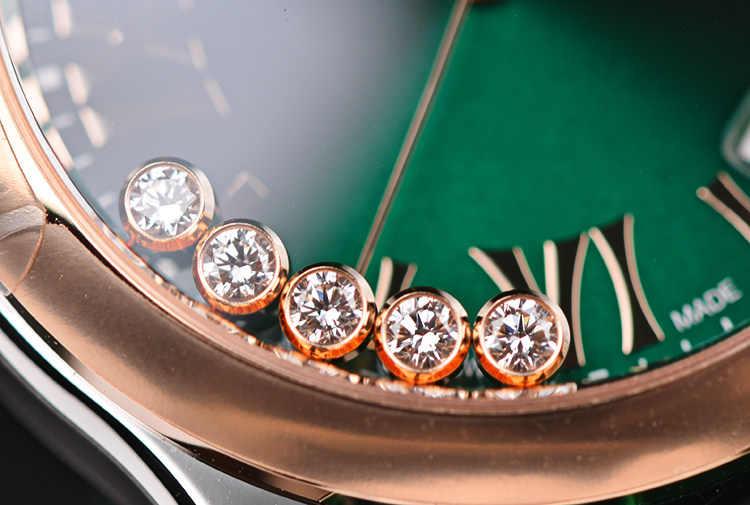 表盘:热门立体绿色表盘,玫瑰金刻度及指针,五颗活动钻,约0.24克拉,蓝宝石表冠,约0.1克拉