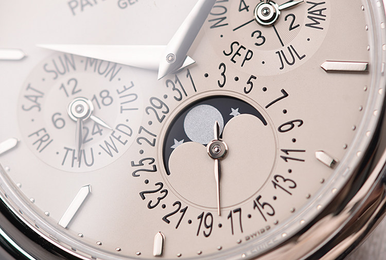 表盘:立体银白色表盘,白金刻度及指针,万年历,月相,昼夜显示