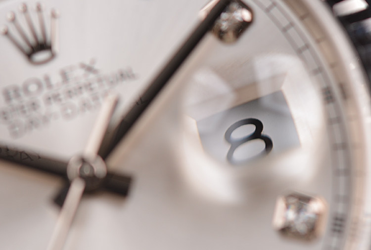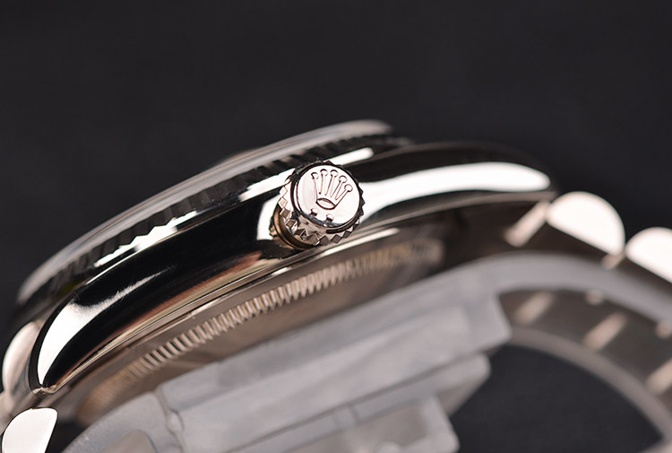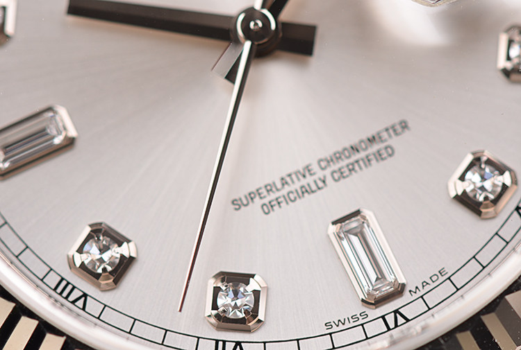 表盘:立体银色表盘,白金指针,钻石时标,其中6、9点为长条钻,放大镜日历