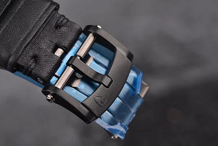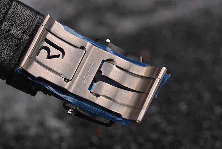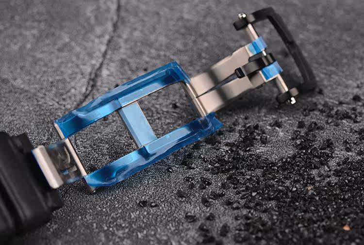 表壳:黑色PVD精钢及泰坦尼克号沉船残骸混合物料表壳及折叠表扣,手工缎面拉丝表圈