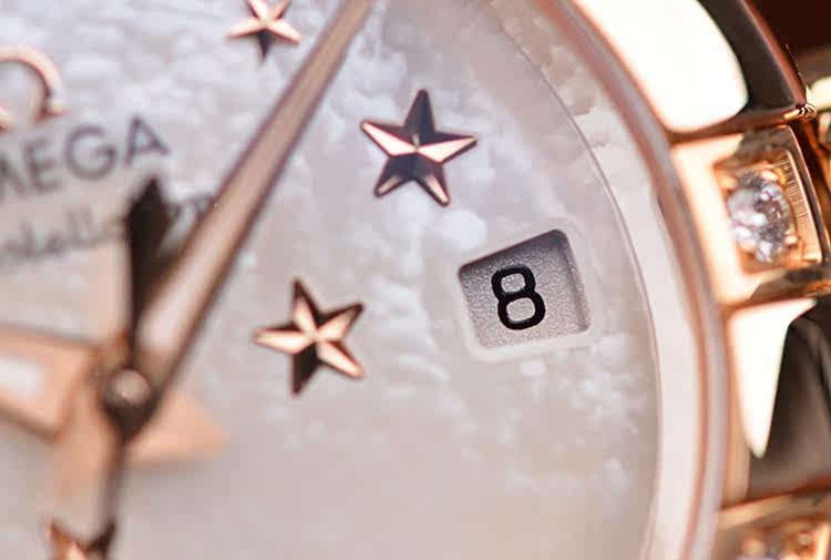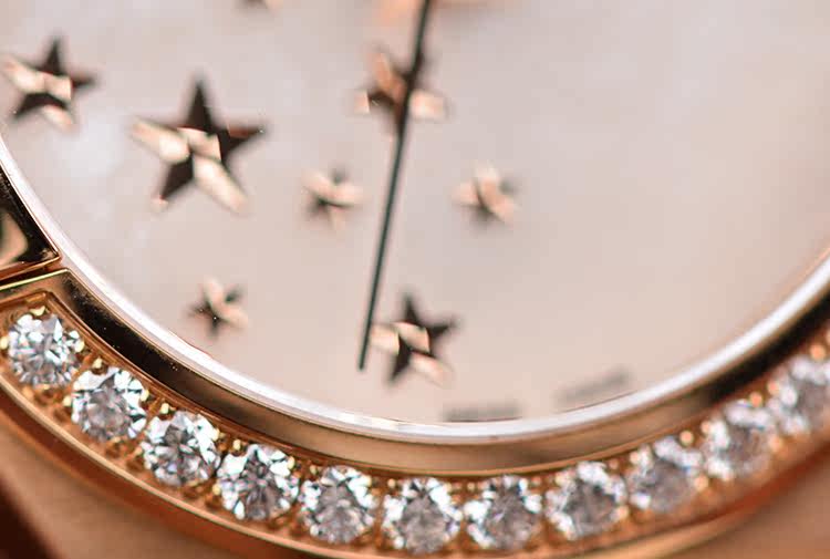 表盘:银白色珍珠贝母表盘,镶贴立体玫瑰金五角星图案,玫瑰金指针,日历显示