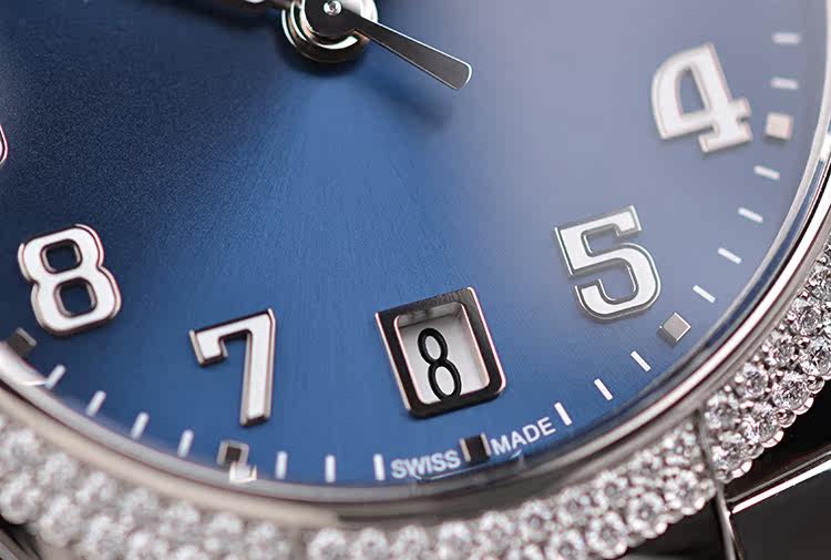 精钢原镶钻蓝面大三针日历钢带女表