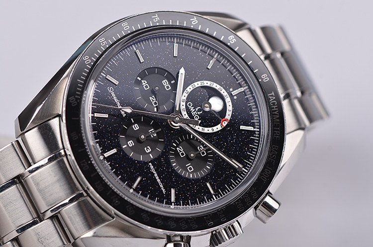 表盘:立体黑色天然砂金石计时表盘,指针日历,月相显示,夜光刻度及时分针