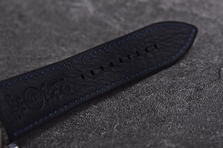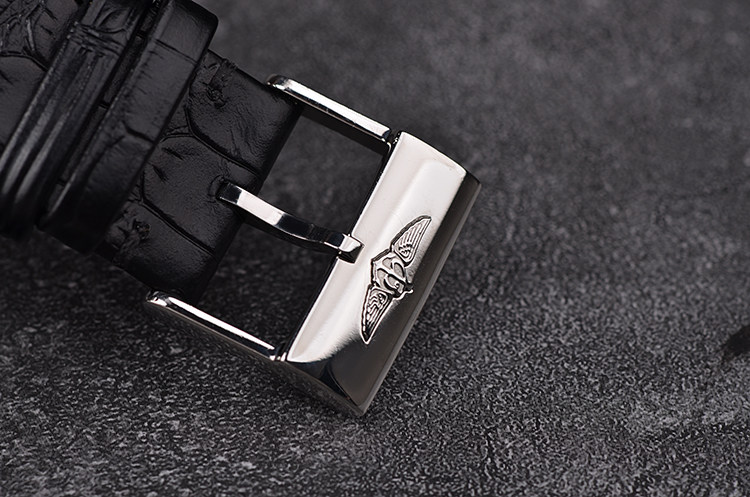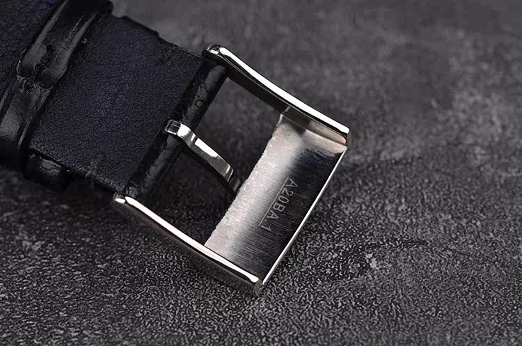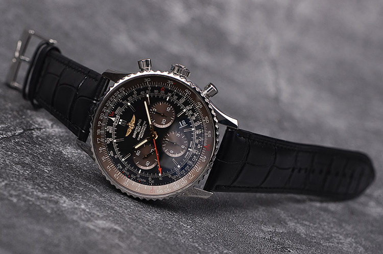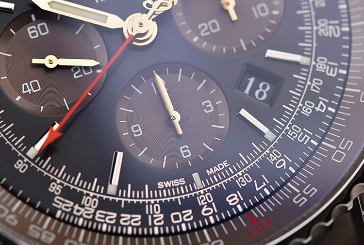 表盘:立体黑色计时表盘,巧克力色小表盘及飞行滑尺表内圈,日历显示