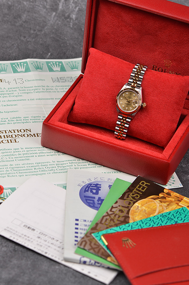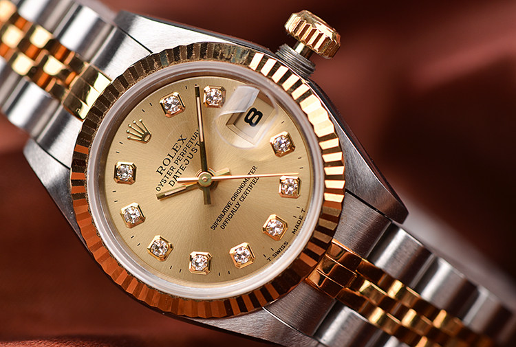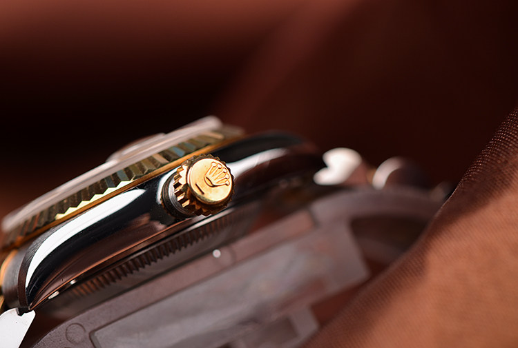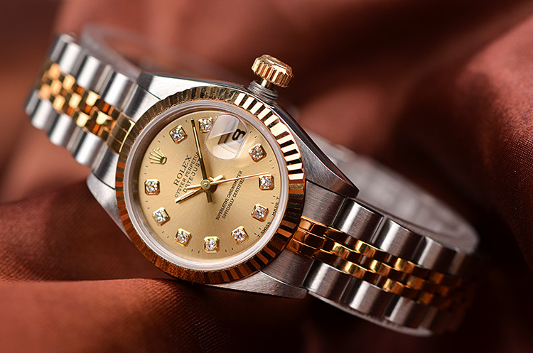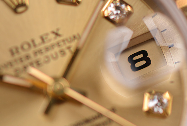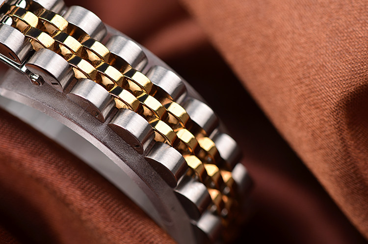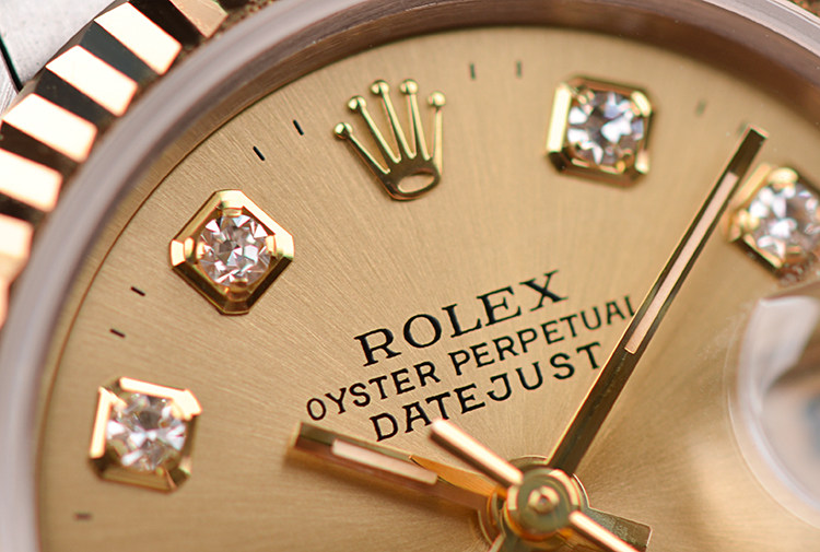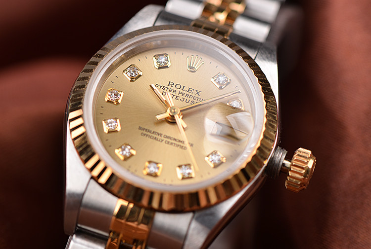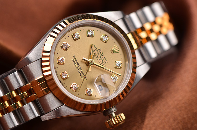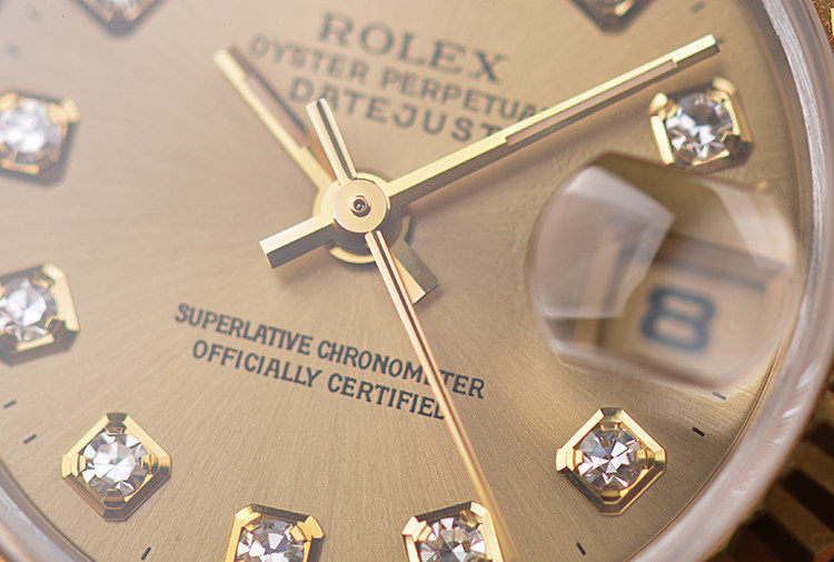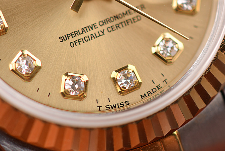 表盘:立体香槟金色面盘,黄金指针,10颗钻石时标