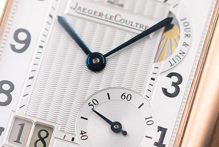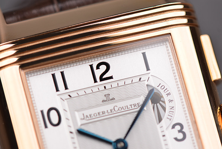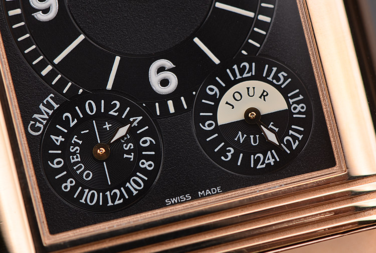 表盘:正面立体银白色表盘,蓝钢指针,阿拉伯数字刻度,大日历视窗,昼夜显示,背面立体黑色表盘,第二时区显示,玫瑰金指针,动力储备显示,第二时区昼夜显示,时差显示
