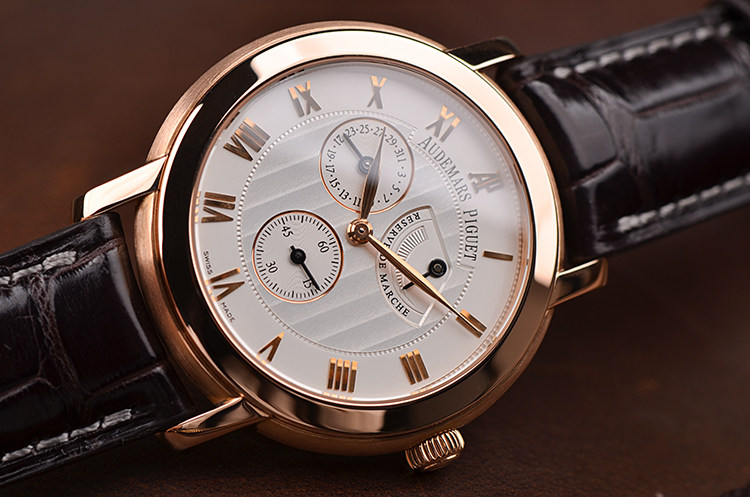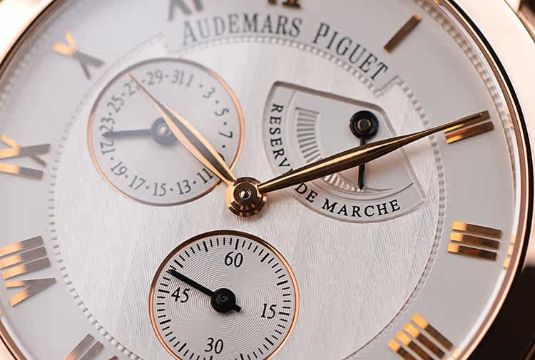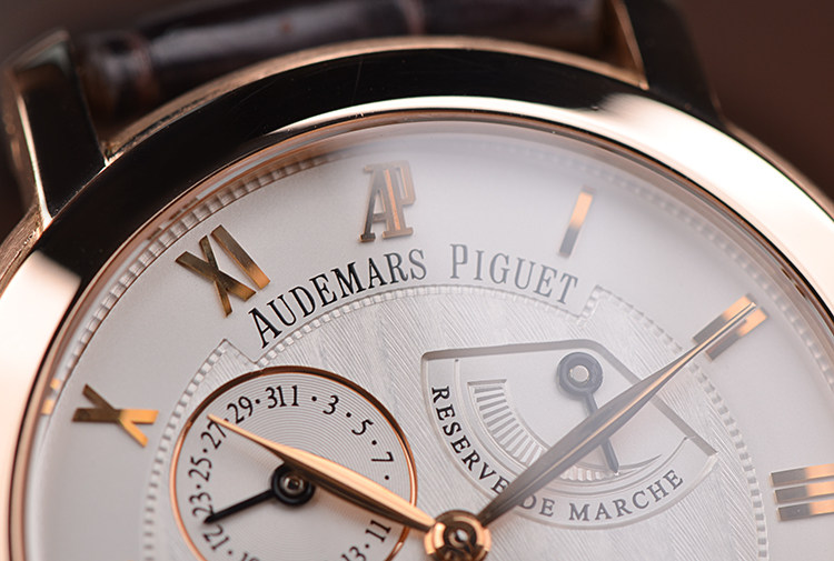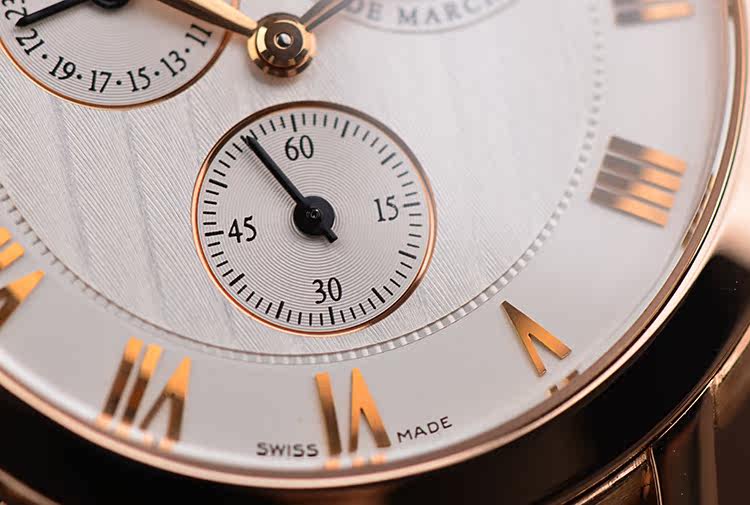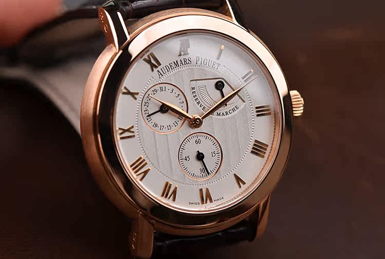 表盘:立体银白色日内瓦条纹表盘,玫瑰金罗马数字刻度及时分针,动力储备显示,指针式日历