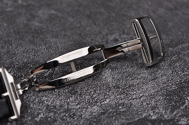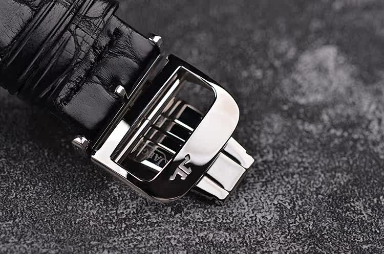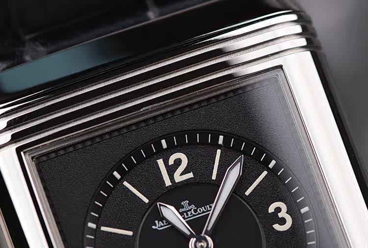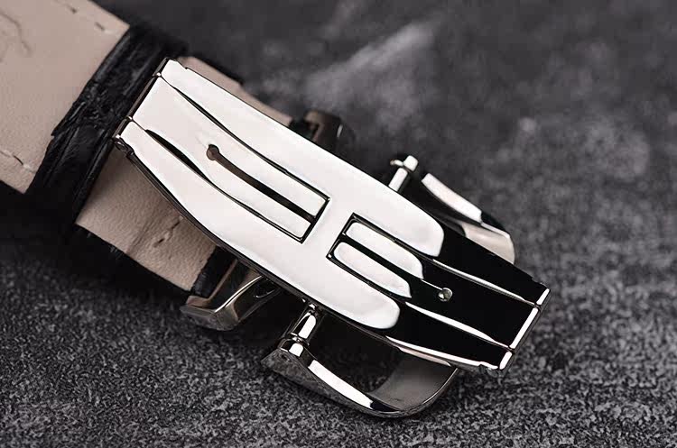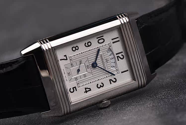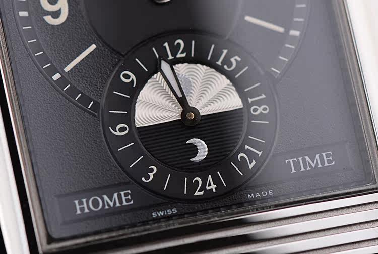 表盘:正面立体银白色镌刻表盘,蓝钢指针,阿拉伯数字刻度,日历显示,背面立体黑色表盘,第二时区显示,昼夜显示