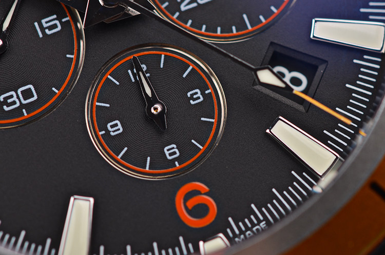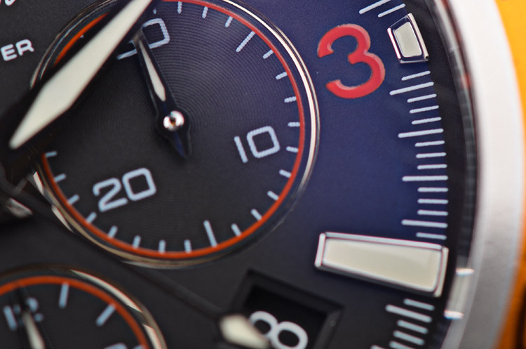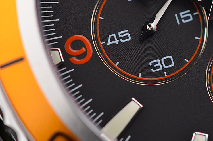 表壳:精钢表壳,橙色单向可旋转计时表圈