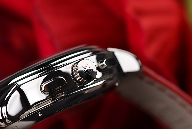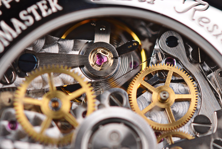 表盘:立体银白色镂空计时表盘,红色阿拉伯数字刻度,动力储备显示