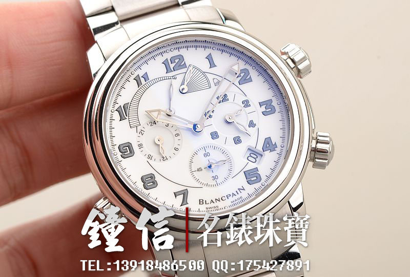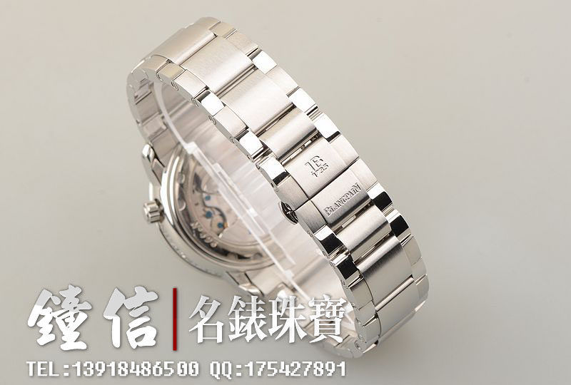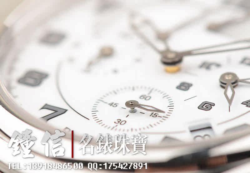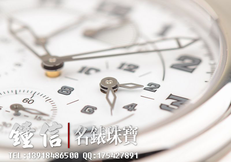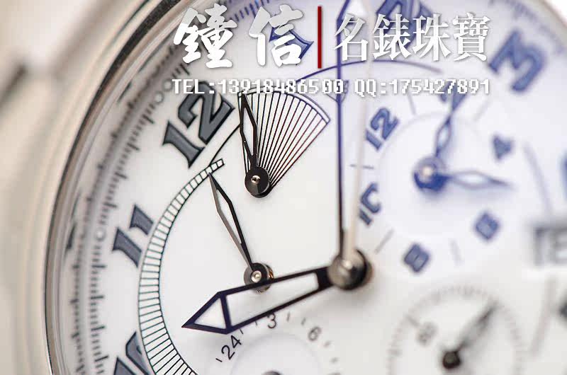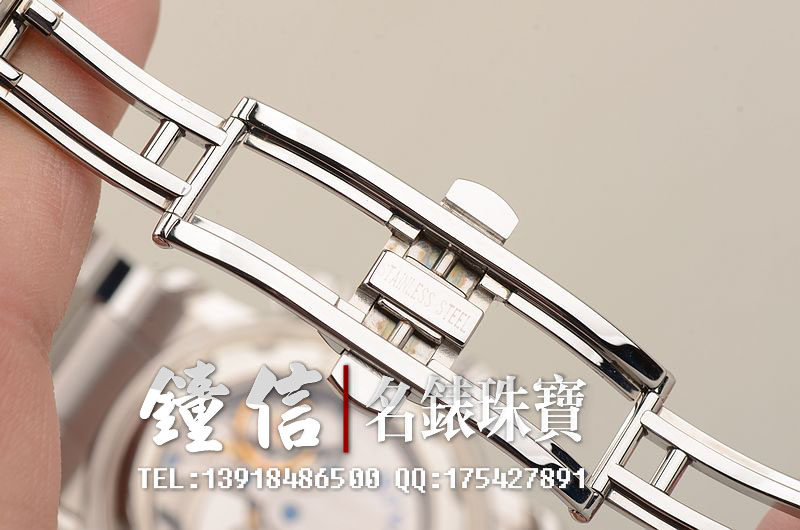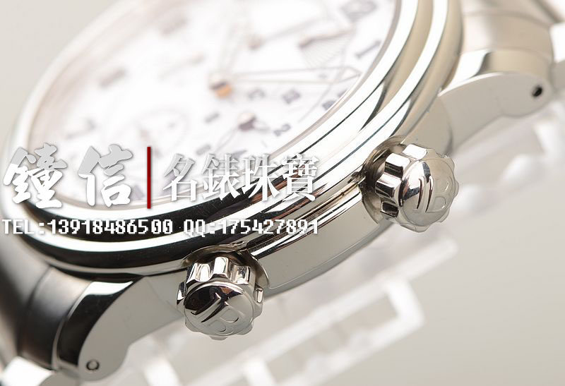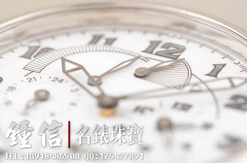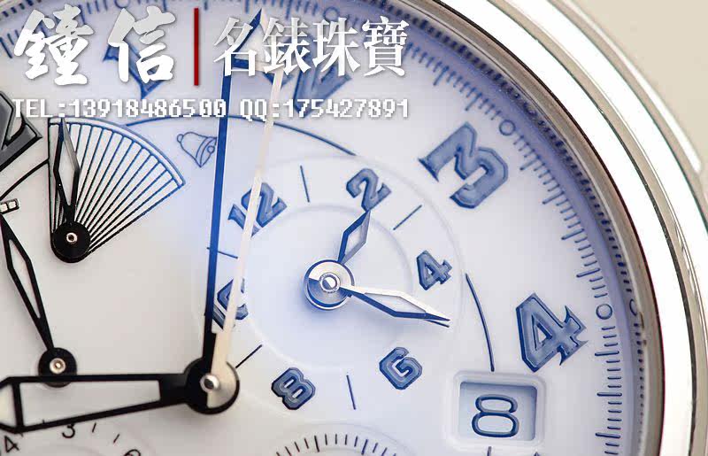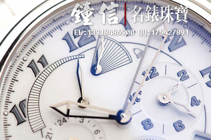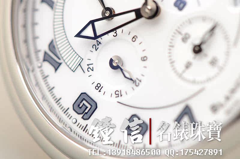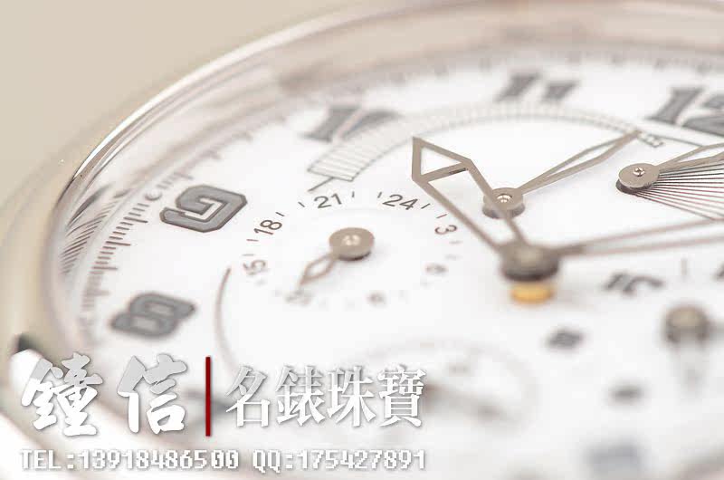 精钢表壳及链带,双向按压折叠式表扣,蓝宝石水晶镜面及底盖。立体白色低温仿瓷表盘,夜光指针及刻度,12点位闹铃开关显示,3点位闹铃时间显示,4点位日历显示,6点位独立小秒针,9点位第二时区时间显示,10点位指针式闹铃动力储备显示。旋入式防水表把。口径40MM*13.3MM。防水100M。