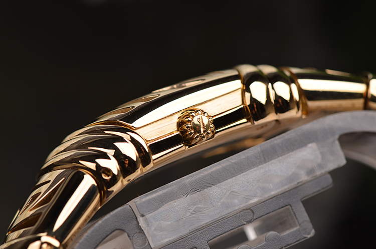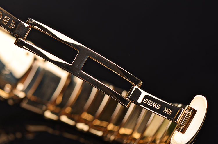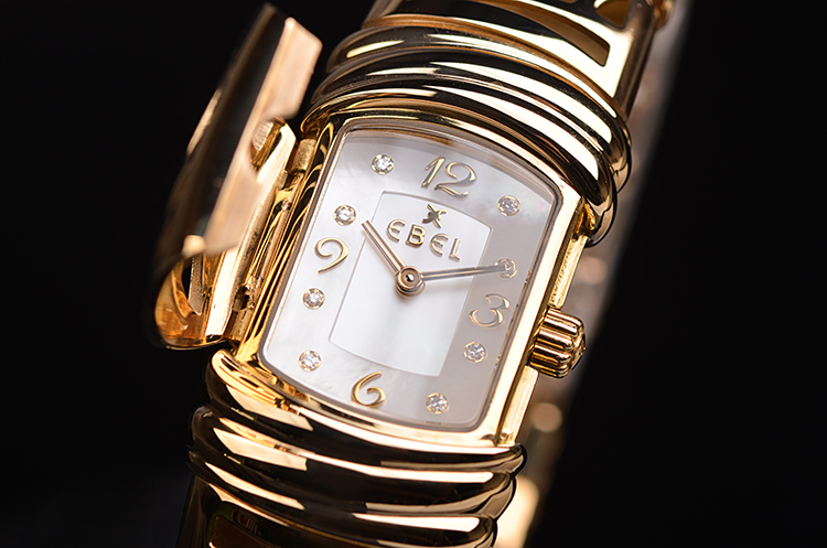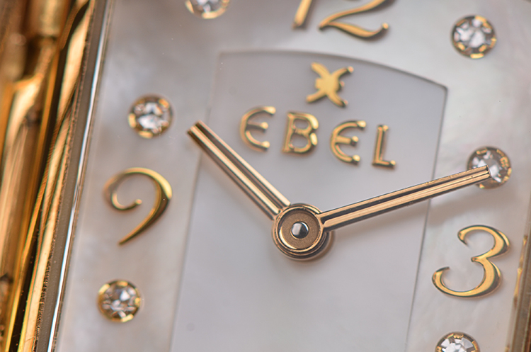 表盘:立体银白色珍珠贝母表盘,黄金指针,8颗钻石时标