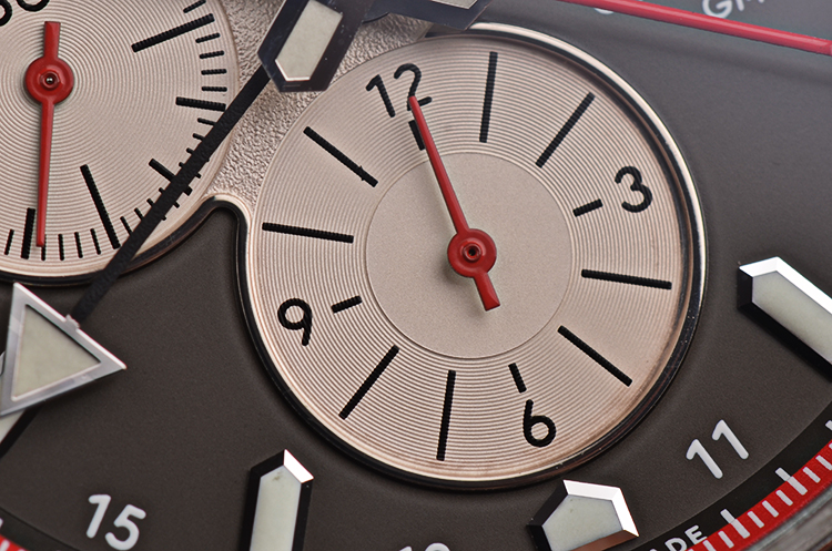 表盘:立体深灰色计时表盘,银白色小表盘,夜光刻度及指针,日历显示,GMT指针