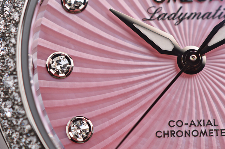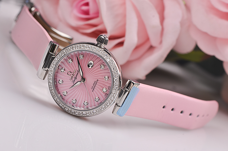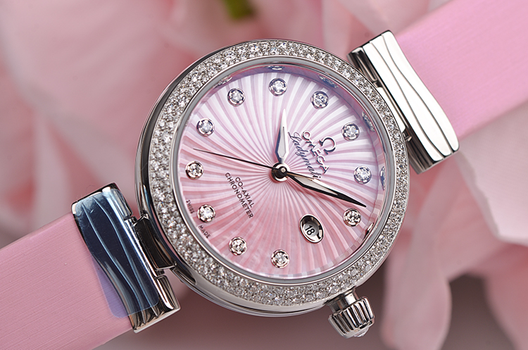 表盘:立体粉色太阳纹珍珠贝母表盘,夜光时分针, 11颗钻石时标(共计0.12克拉)