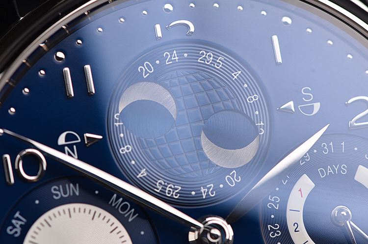 表盘:立体深蓝色万年历南北月相表盘,动能储备显示