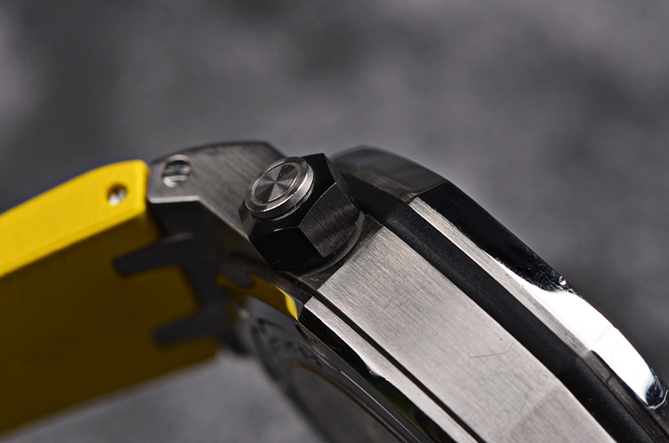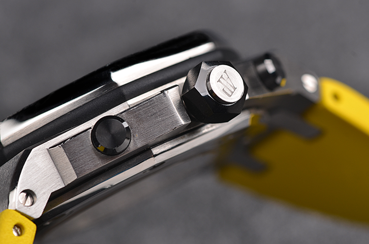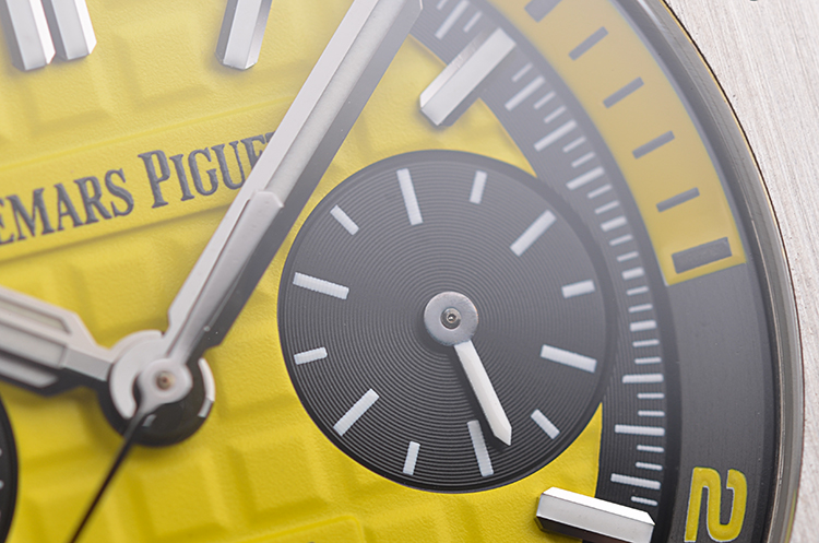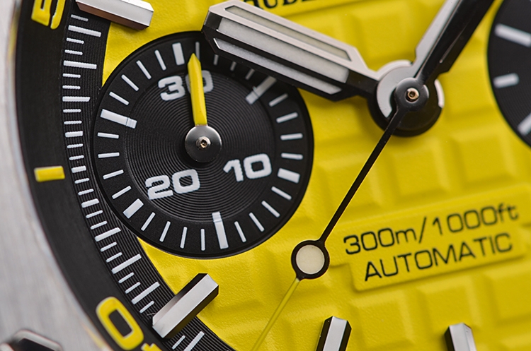 表盘:立体黄色华夫格计时表盘,黑色小表盘,1/4黄色可旋转表内圈,夜光刻度及指针