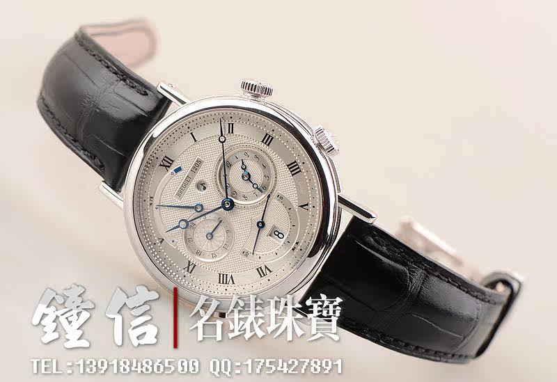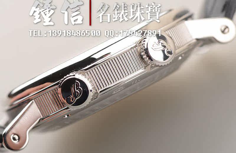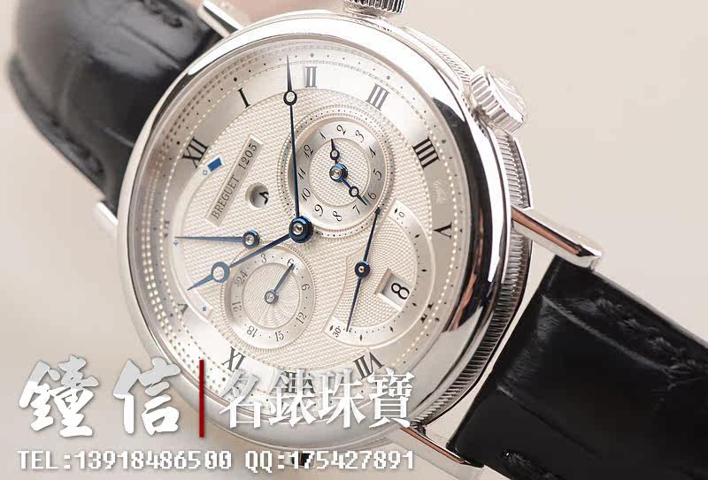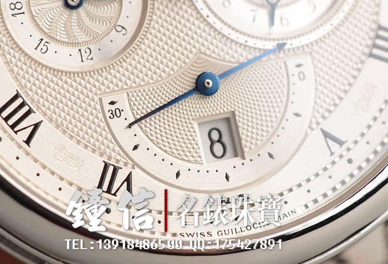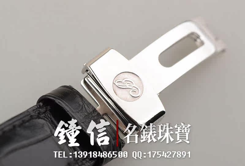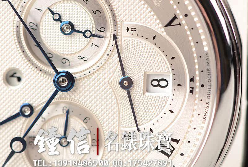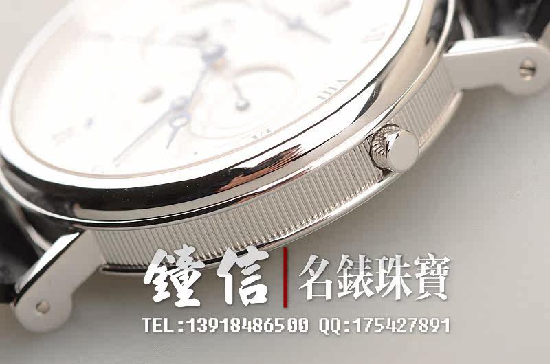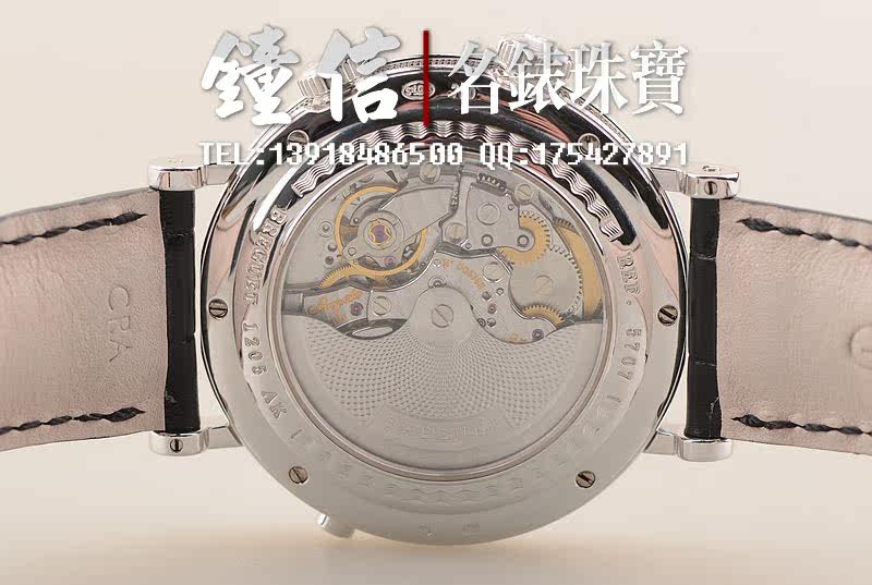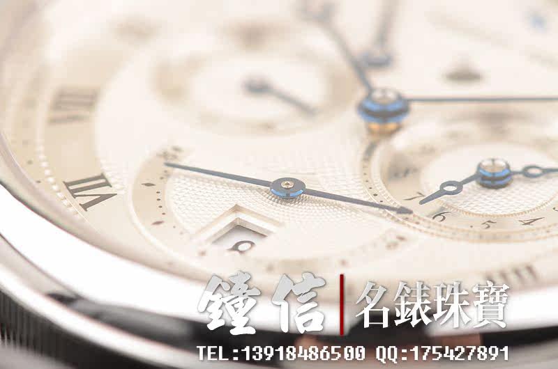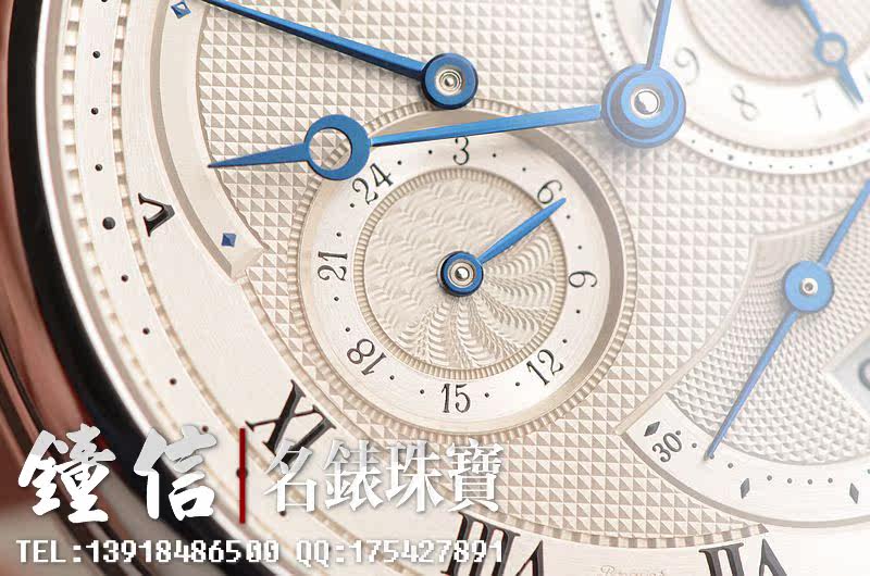 18K白金钱币纹表壳及折叠式表扣,圣伯纳狗头印记。原厂黑色路易斯安娜鳄鱼皮表带成色极新,基本未使用状态。蓝宝石水晶镜面及底盖,立体手工镌刻白金镀银表盘,蓝钢宝玑指针,10点至12点位指针式闹铃动储显示,12点位闹铃开关状态显示,9点位指针式GMT第二时区显示,6点位独立小秒针及日历显示功能,3点位闹铃时刻显示。口径39MM*11.35MM。防水30M。