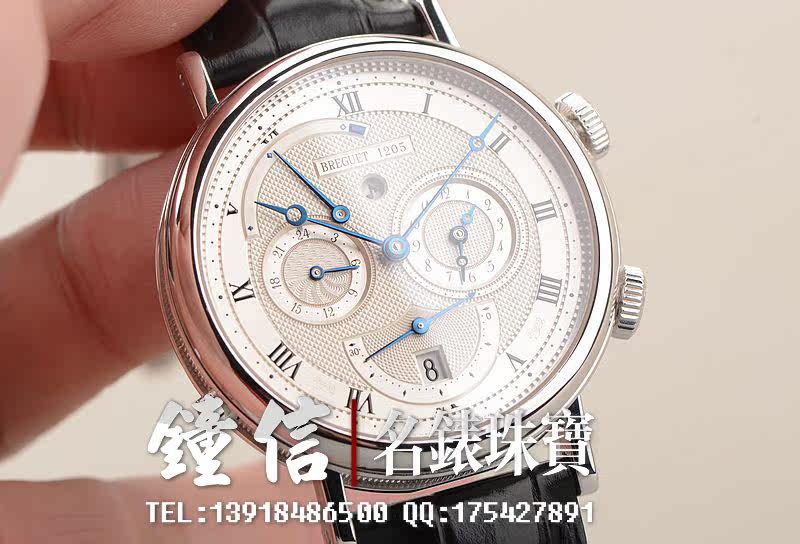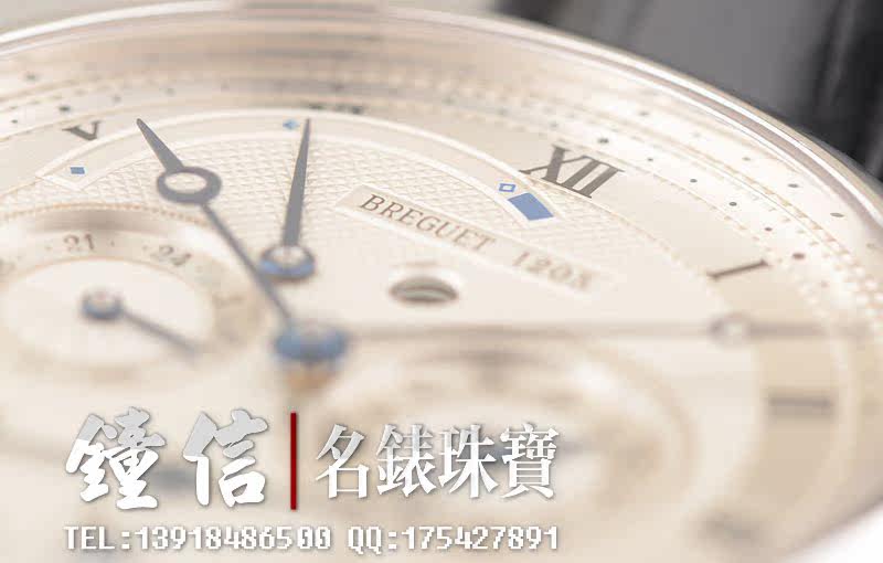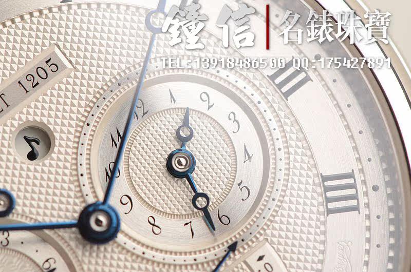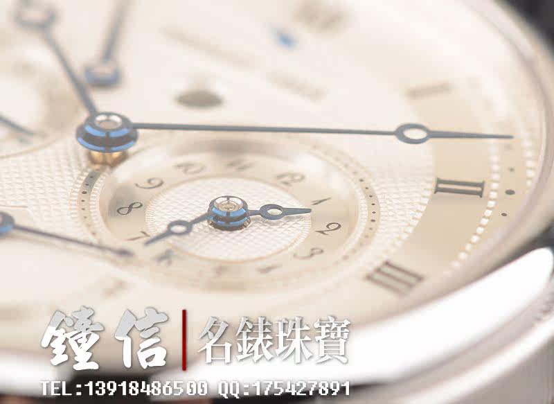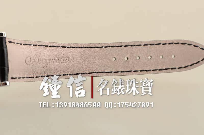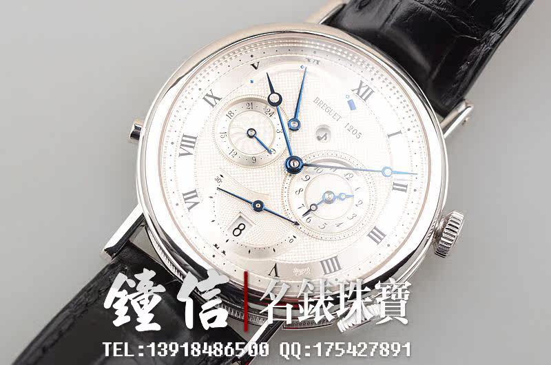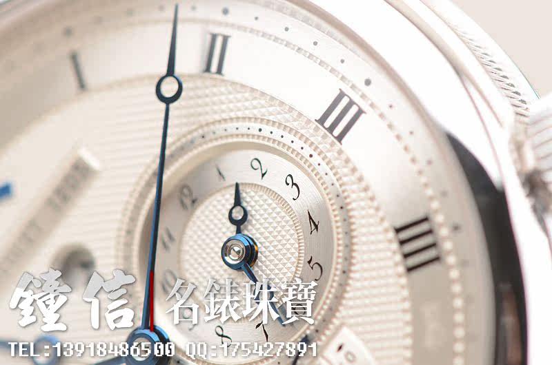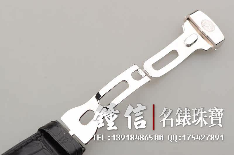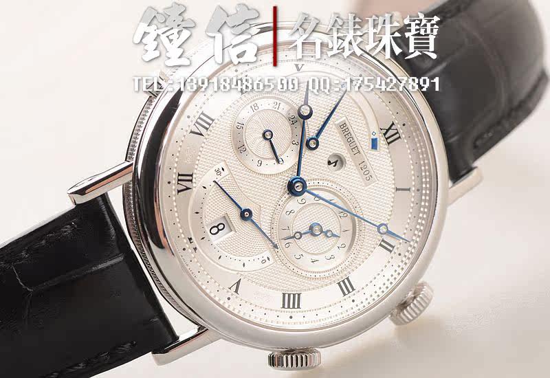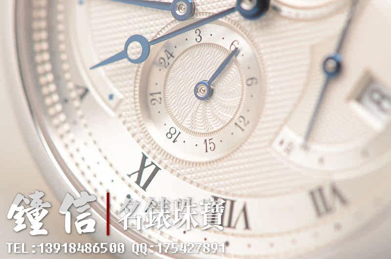 18K白金钱币纹表壳及折叠式表扣,圣伯纳狗头印记。原厂黑色路易斯安娜鳄鱼皮表带成色极新,基本未使用状态。蓝宝石水晶镜面及底盖,立体手工镌刻白金镀银表盘,蓝钢宝玑指针,10点至12点位指针式闹铃动储显示,12点位闹铃开关状态显示,9点位指针式GMT第二时区显示,6点位独立小秒针及日历显示功能,3点位闹铃时刻显示。口径39MM*11.35MM。防水30M。