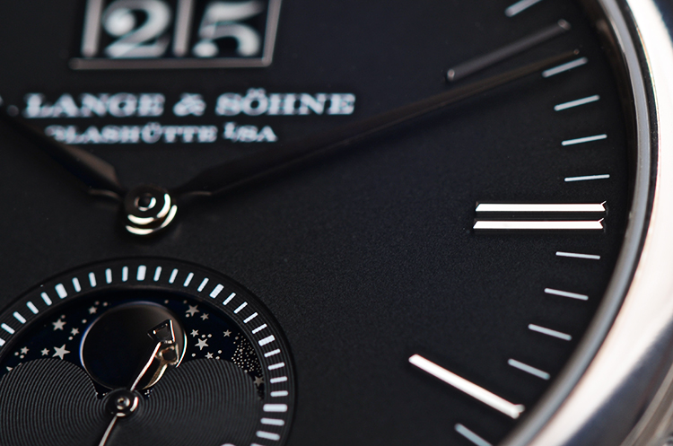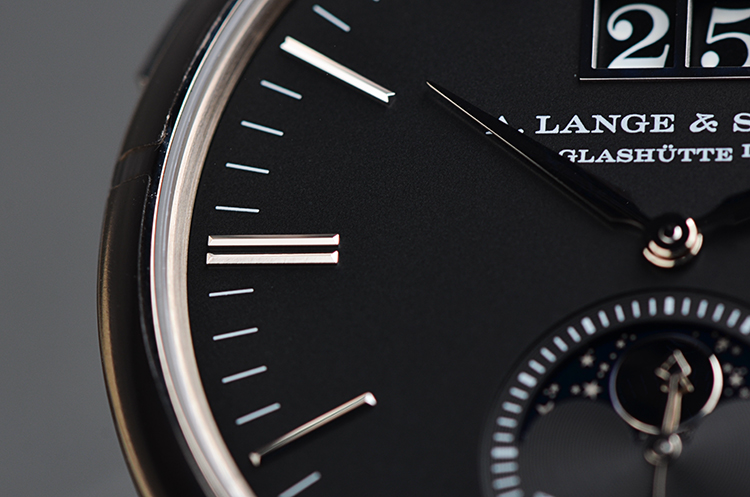 表盘:立体黑色表盘,白金刻度及指针,大日历视窗,月相显示