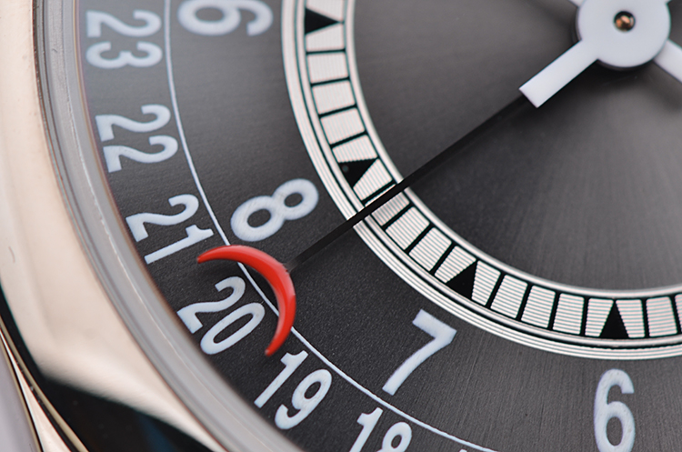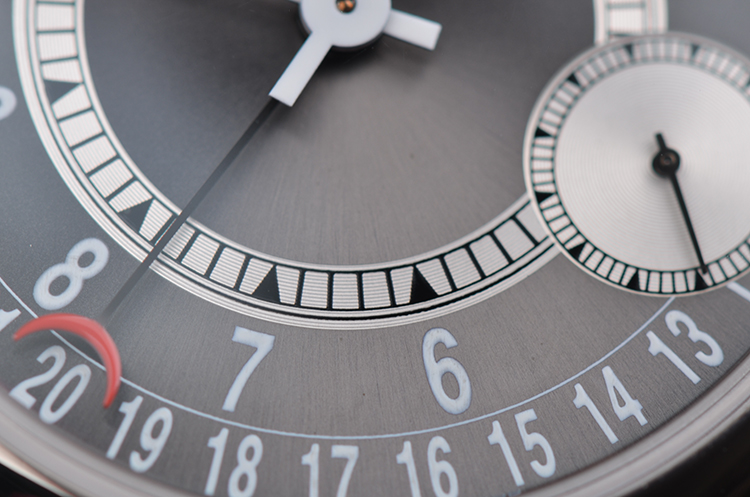 表盘:立体灰色表盘,阿拉伯数字刻度,月牙指针日历