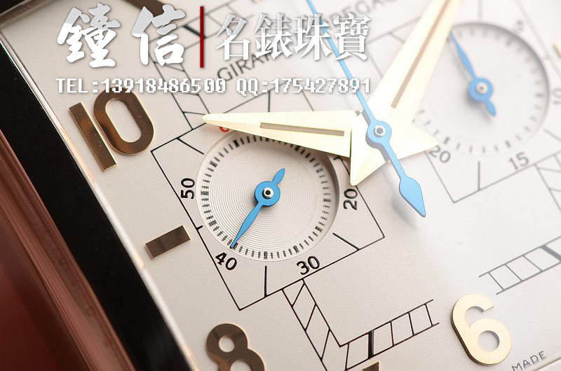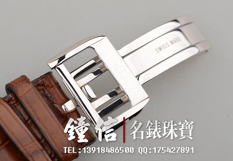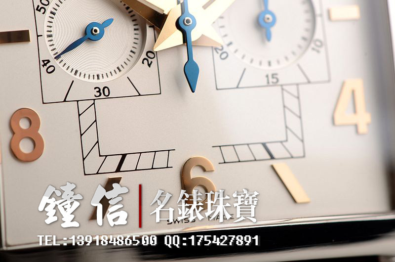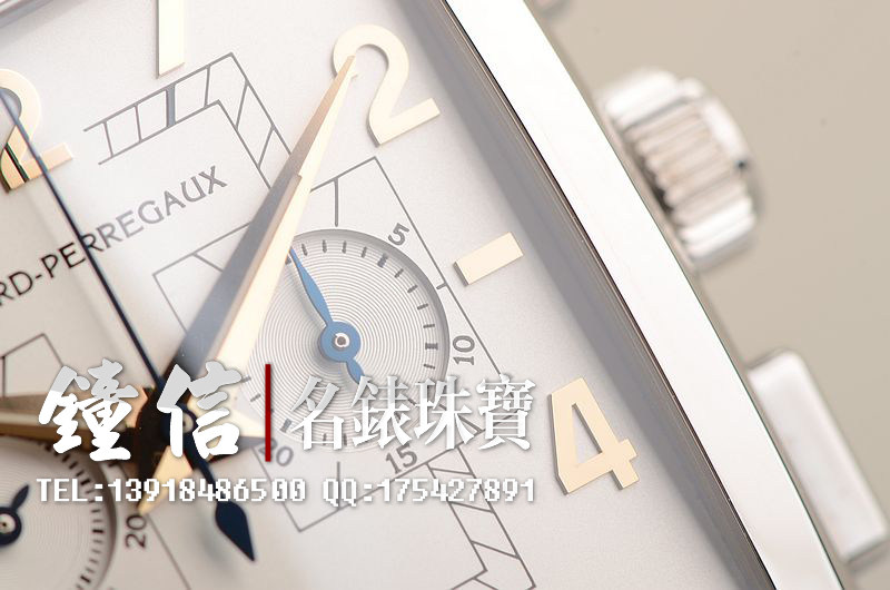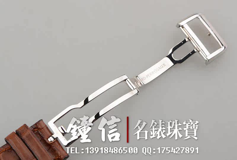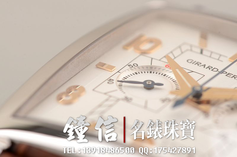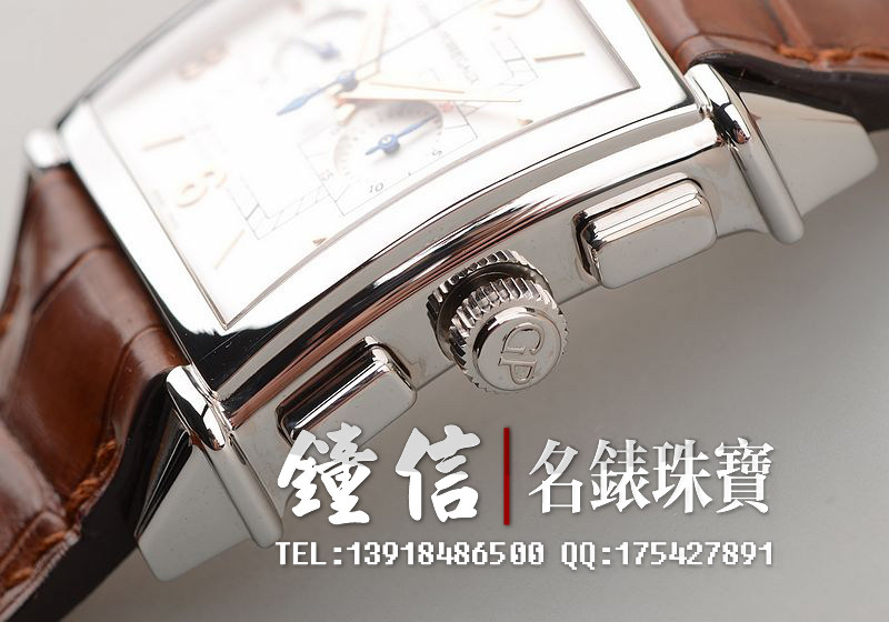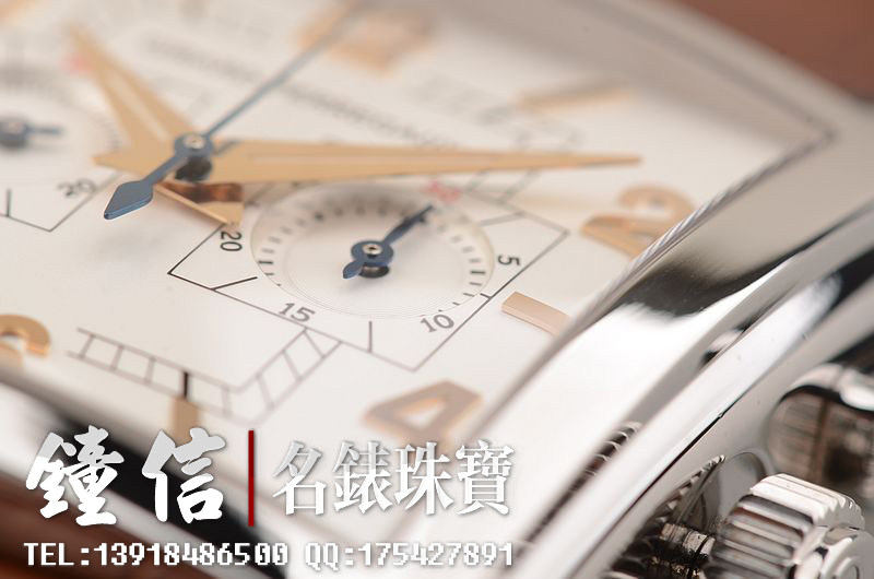 18K白金表壳及折叠式表扣,圣伯纳狗头印记。原厂棕色鳄鱼皮表带成色近全新。蓝宝石水晶镜面及底盖,立体白色计时表盘,玫瑰金指针及刻度,蓝钢计时指针,9点位独立小秒针,3点位30分钟计时。口径47.7MM*34.2MM*13.5MM,相当于圆表42MM左右大小。防水30M。