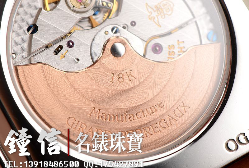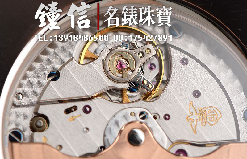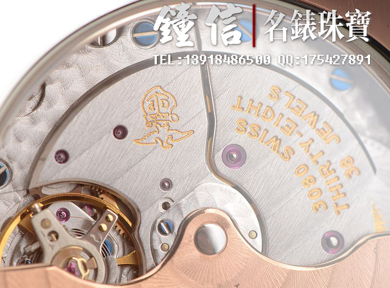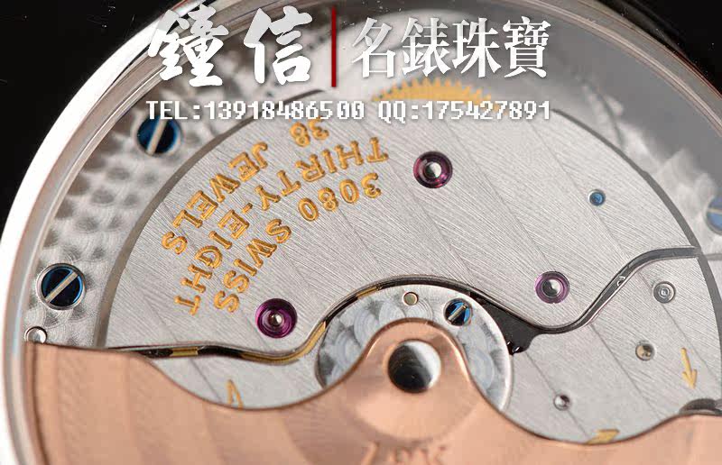 GP自产的CAL.3080型机芯,自动机械,极其精致日内瓦条纹打磨,倒角抛光修饰,38钻,摆频28800,18K玫瑰金镌刻自动转陀。走时状态极佳。