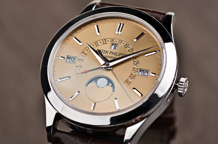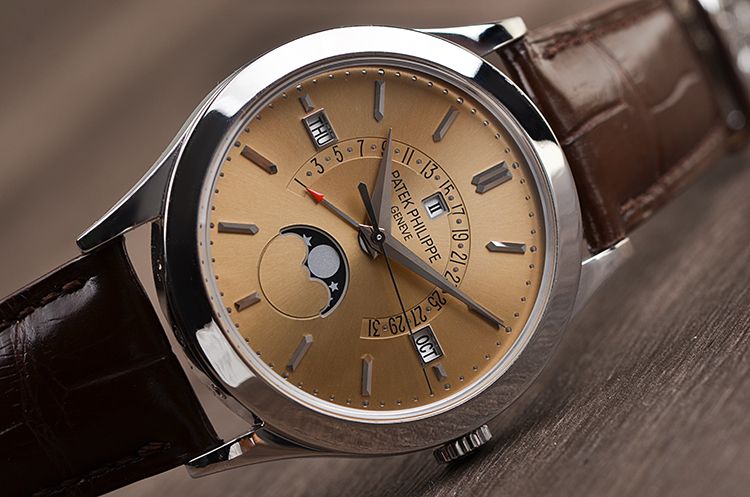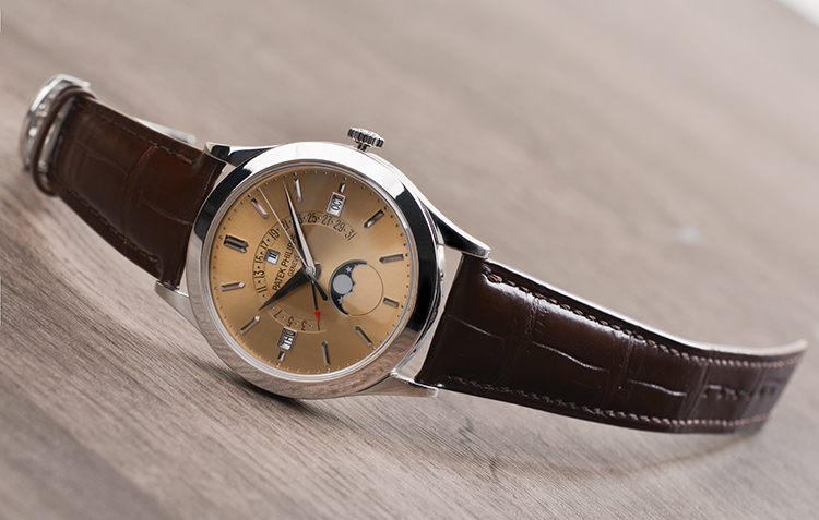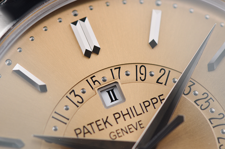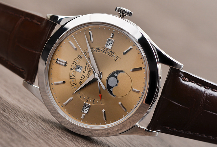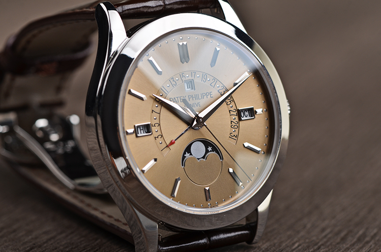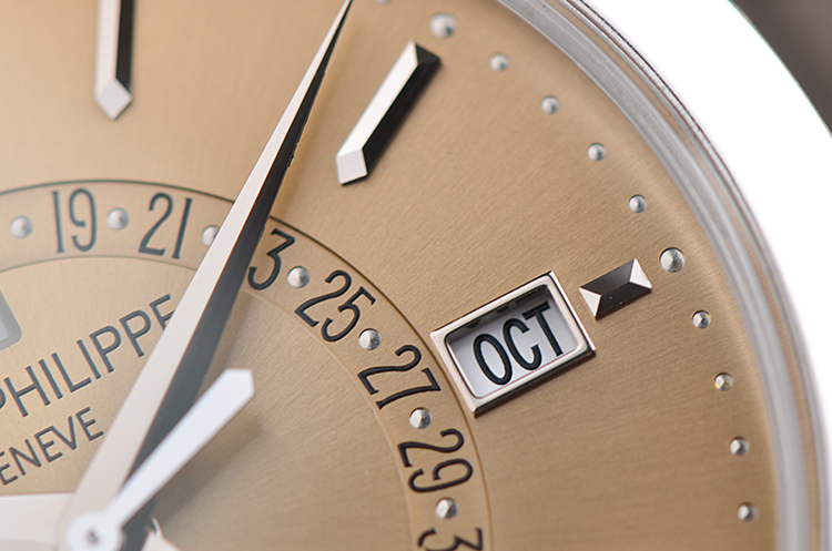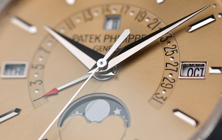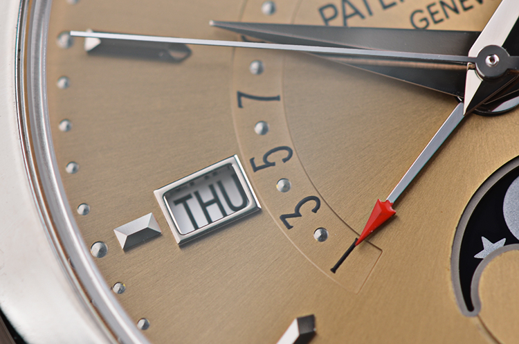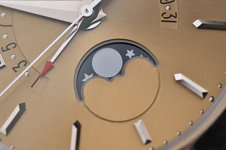 表盘:立体三文鱼色万年历月相表盘,白金刻度及指针