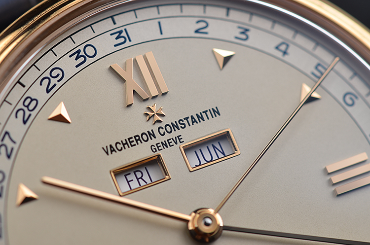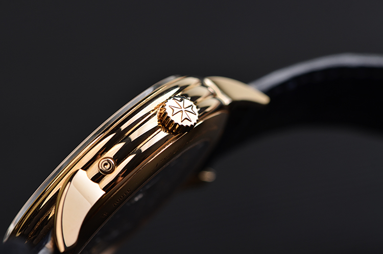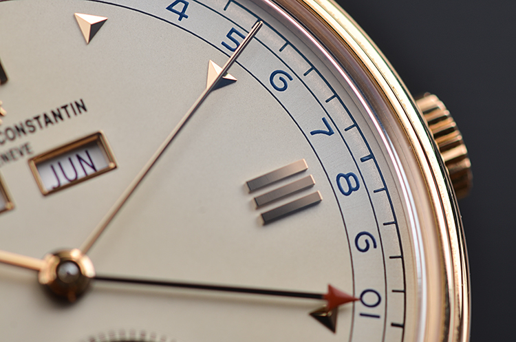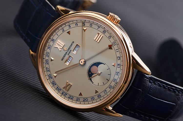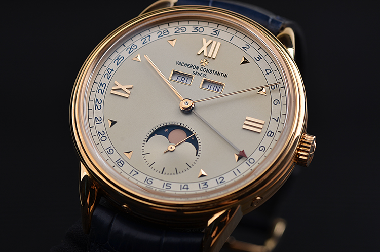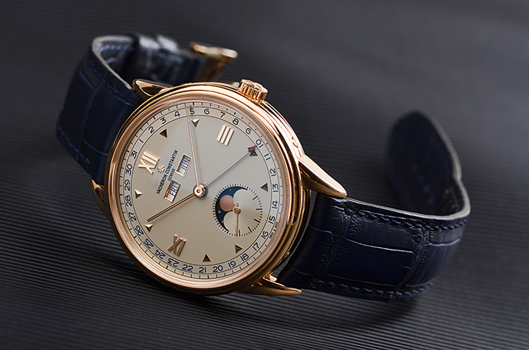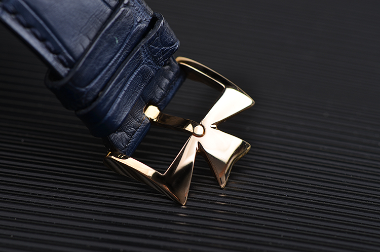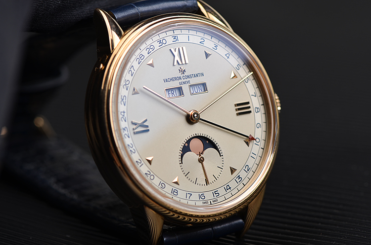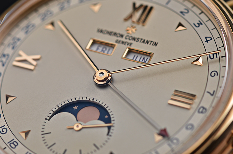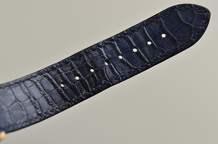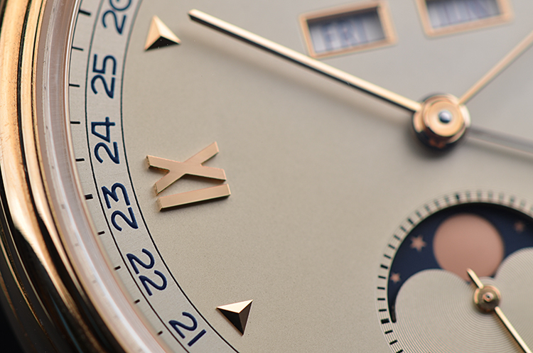表盘:立体浅香槟色表盘,全历显示,蓝色月相,玫瑰金刻度及指针