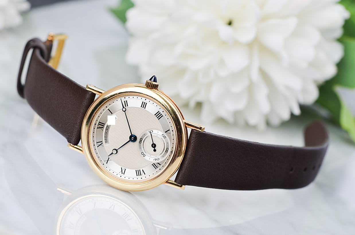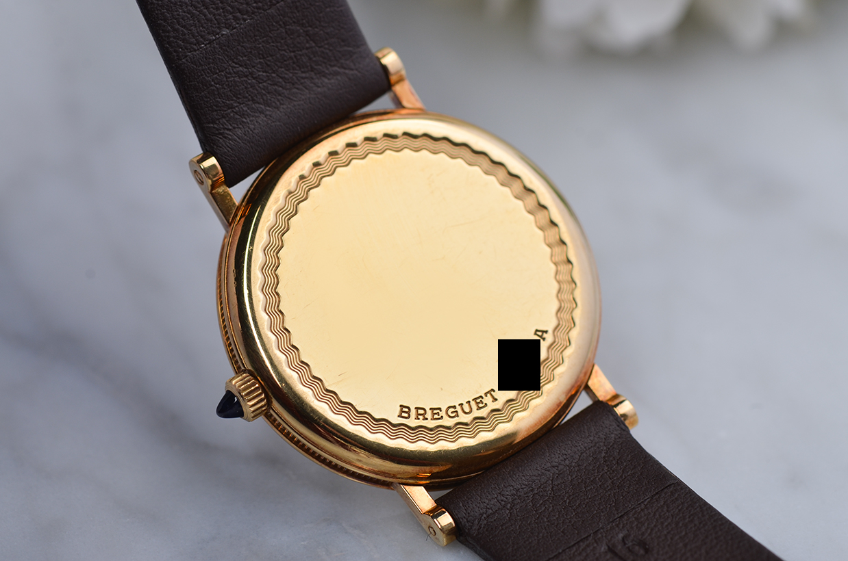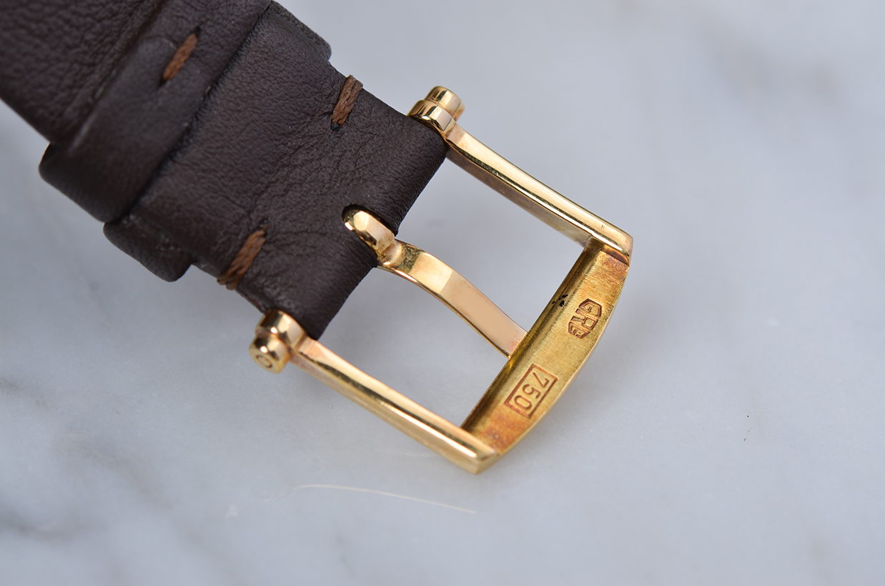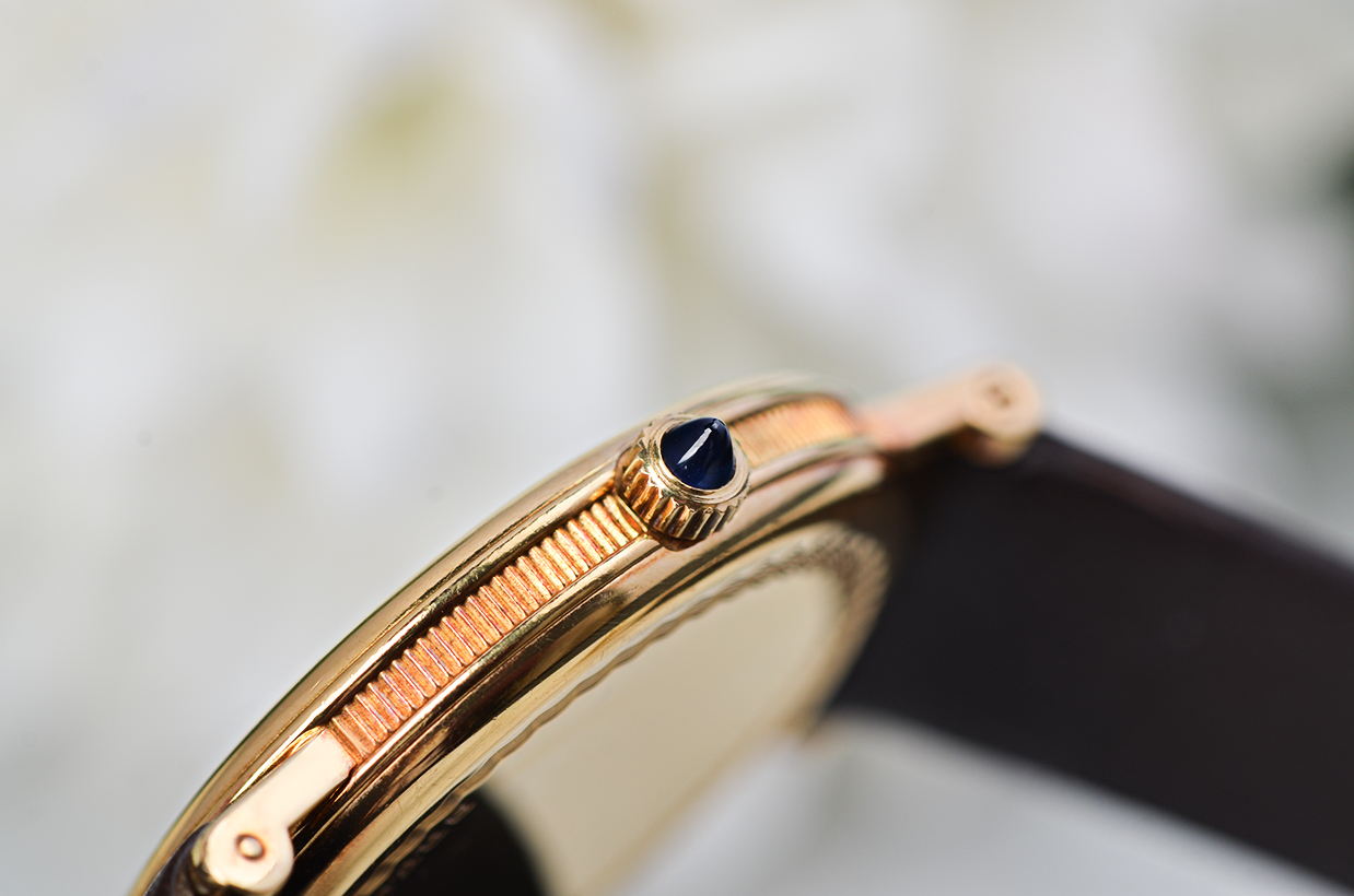 表壳:18K黄金钱币纹表壳,表冠镶嵌一颗蓝宝石