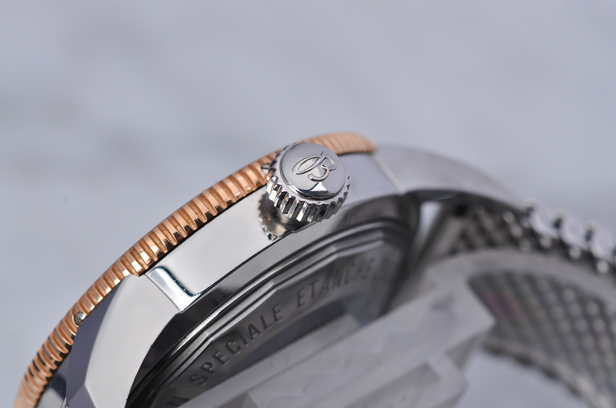表壳:精钢表壳,18K玫瑰金内嵌黑色陶瓷单向可旋转计时表圈