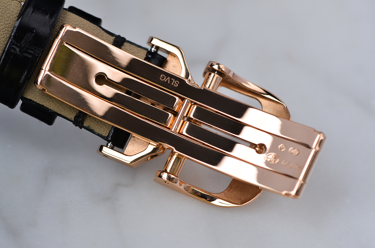 表壳:18K玫瑰金表壳及折叠表扣,少有的双面均原镶钻款,表冠原厂镶嵌一颗大钻