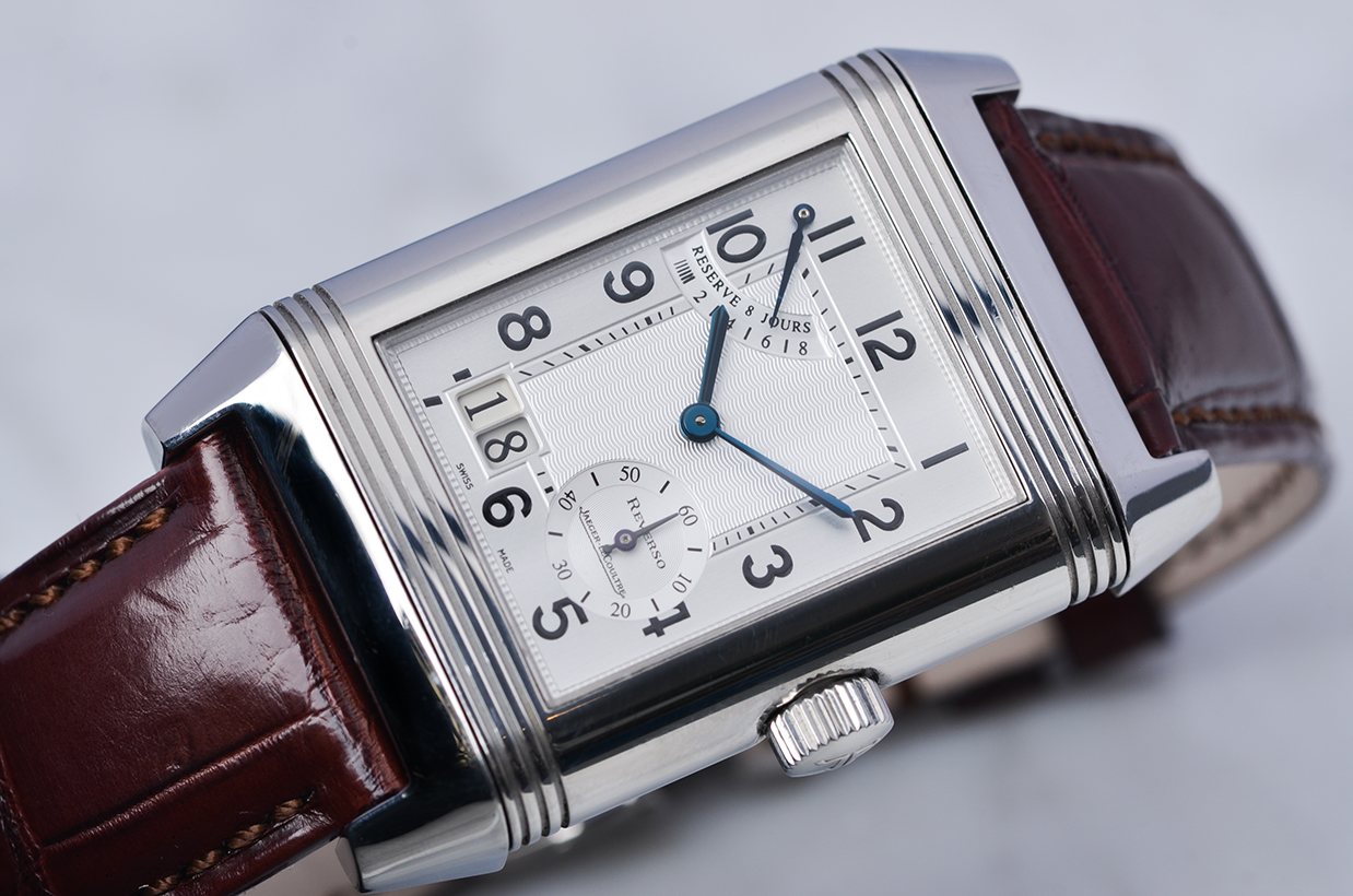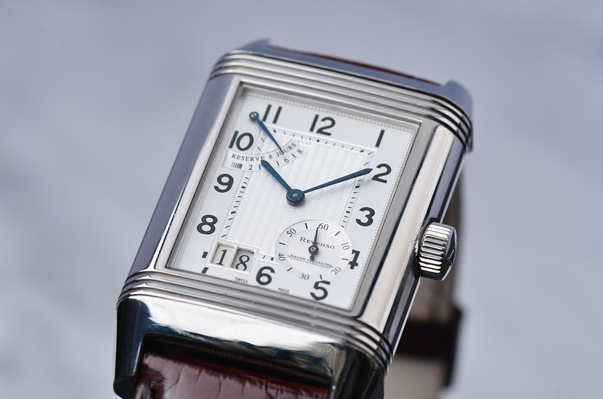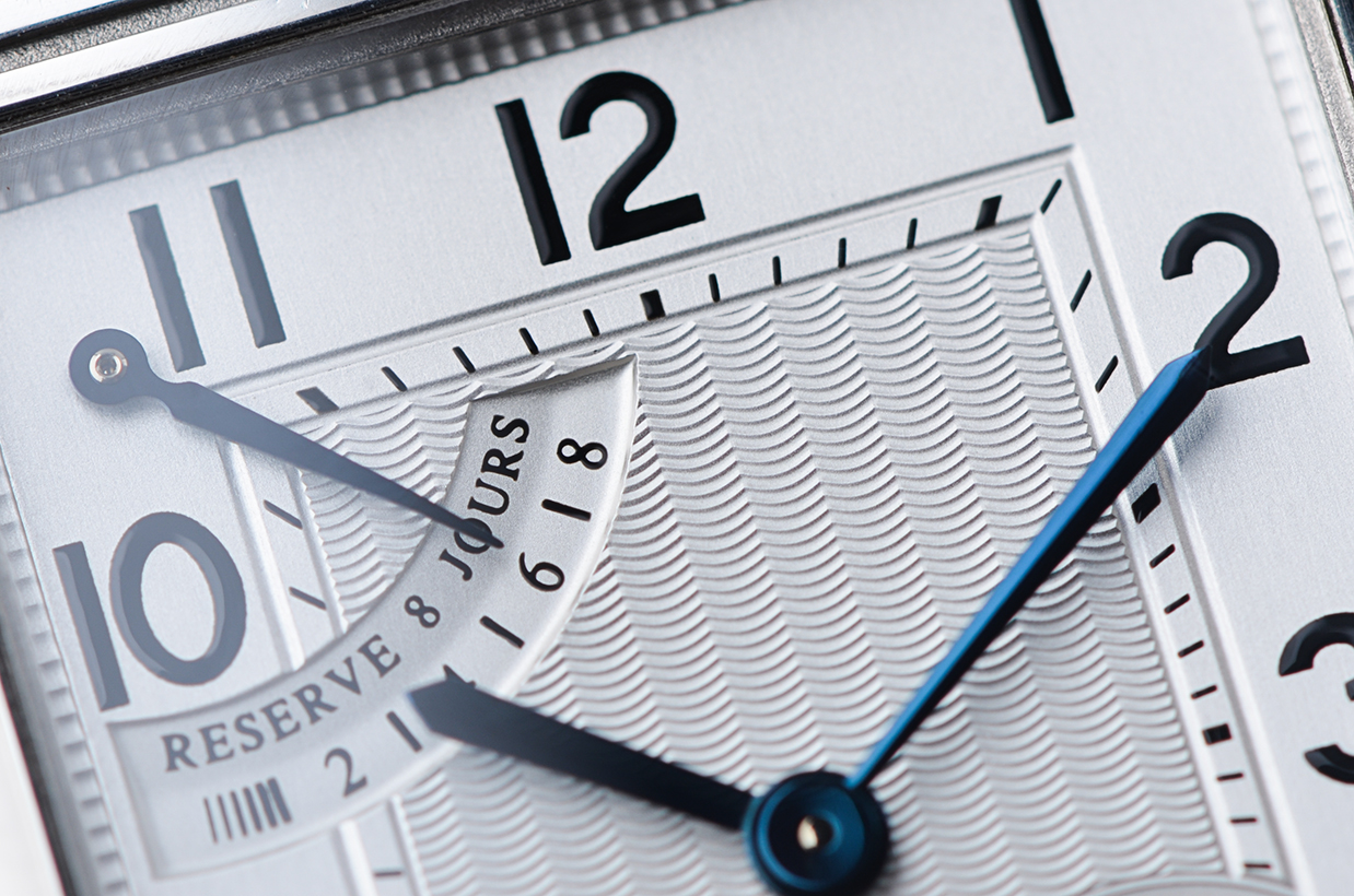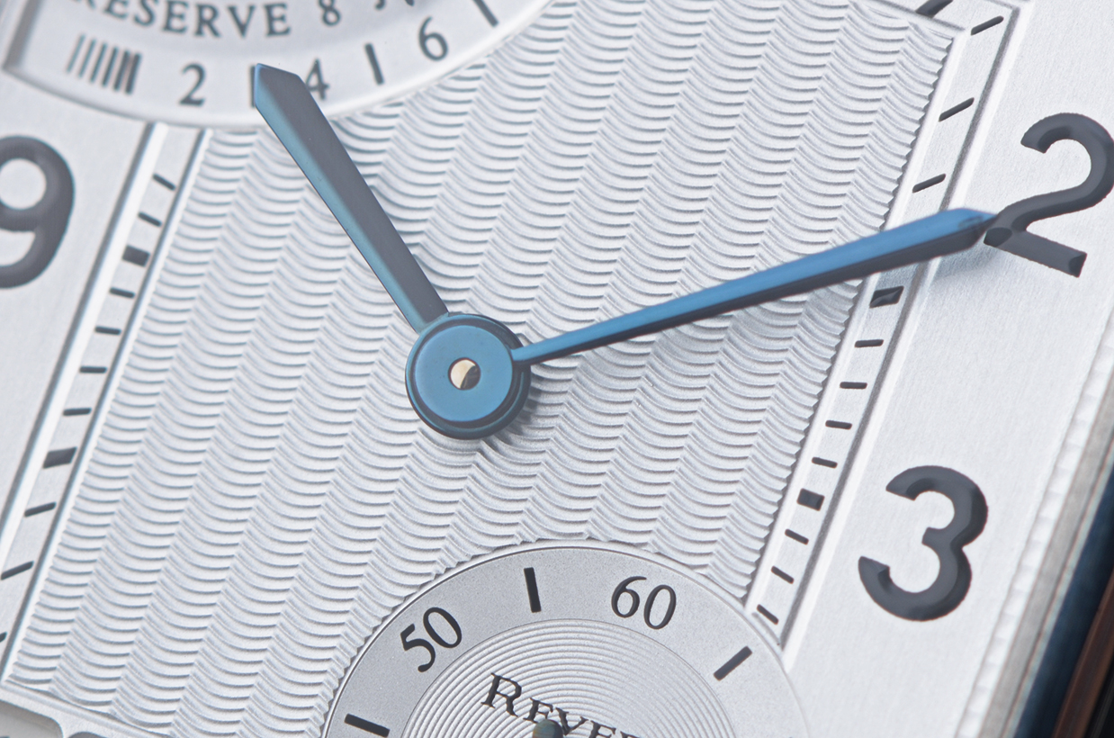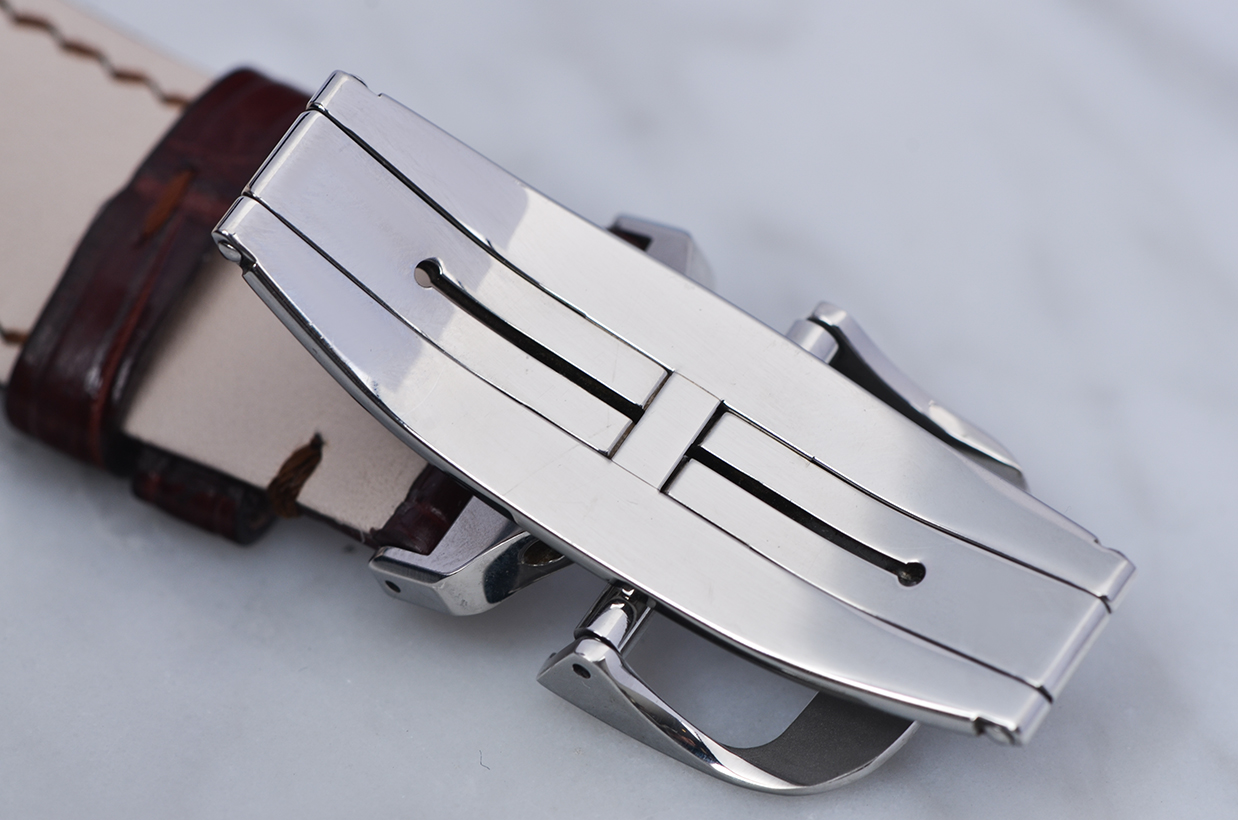 表盘:立体银白色表盘,蓝钢指针,阿拉伯数字刻度,大日历视窗,动力储备显示