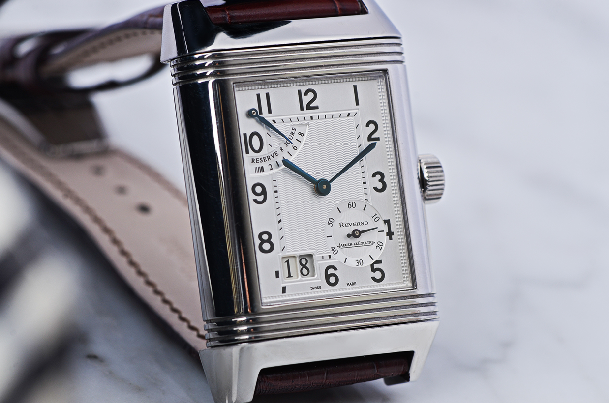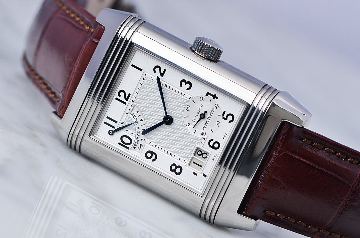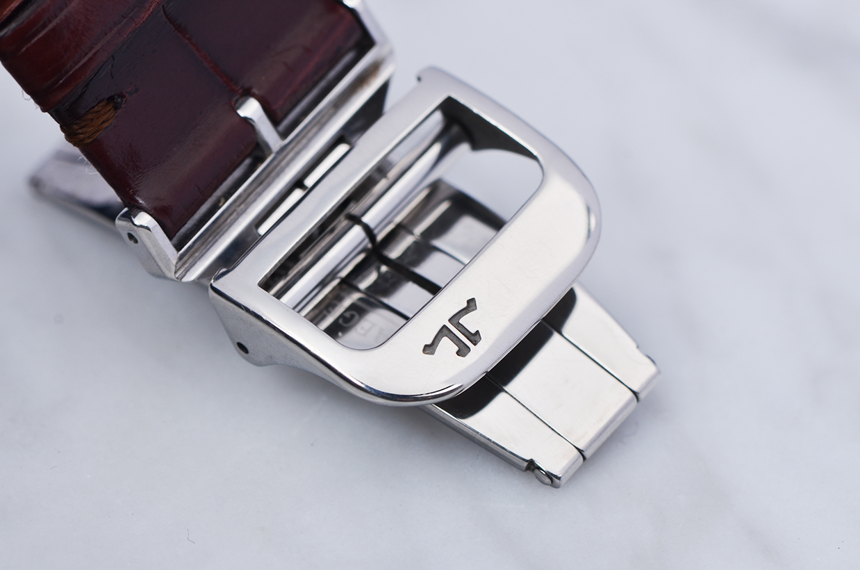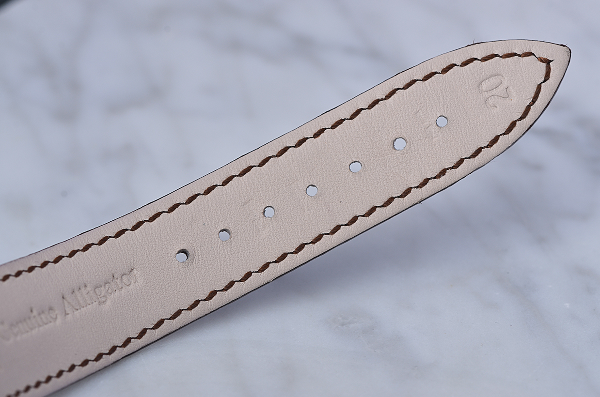 表盘:立体银白色表盘,蓝钢指针,阿拉伯数字刻度,大日历视窗,动力储备显示