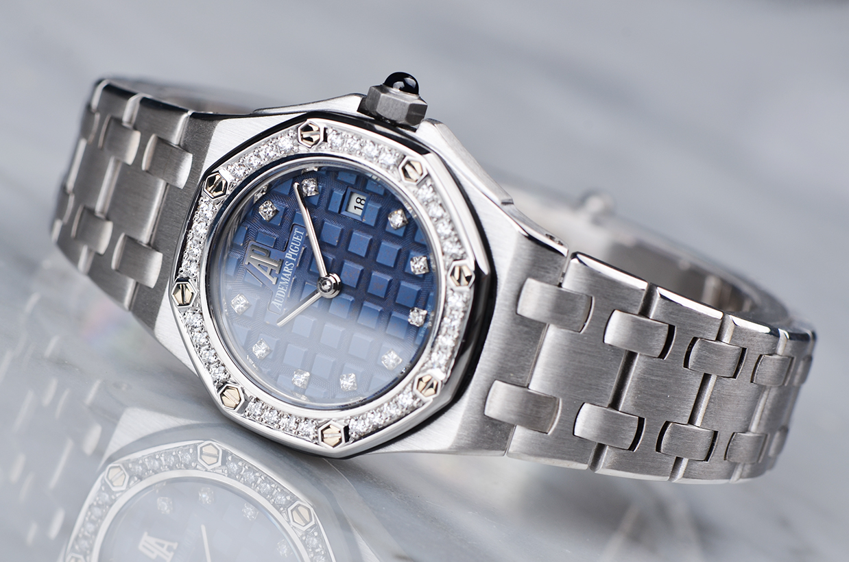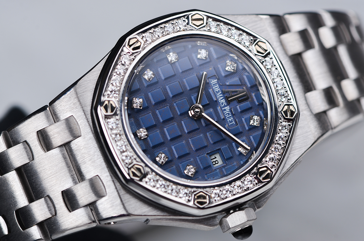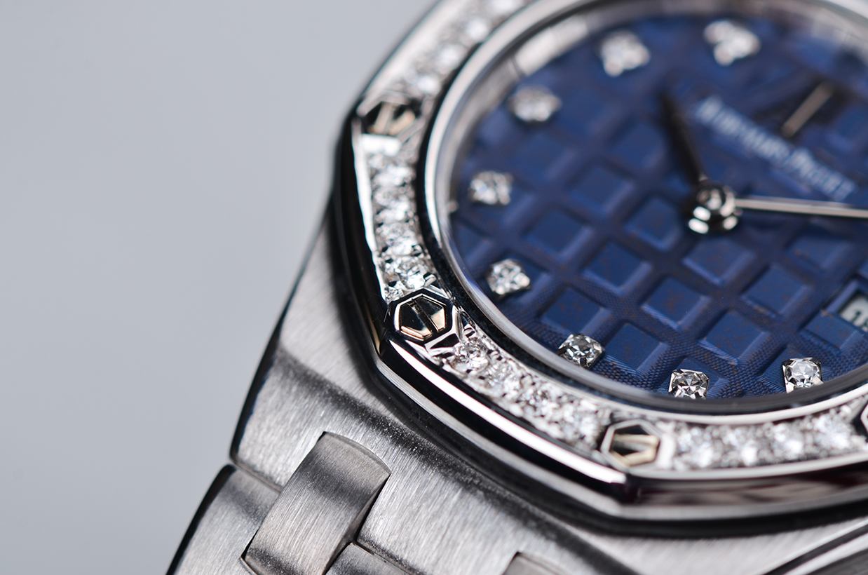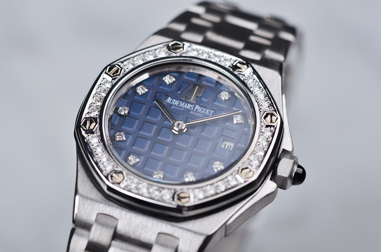 皇家橡树全白金镶钻蓝盘刻度钻29MM石英女表