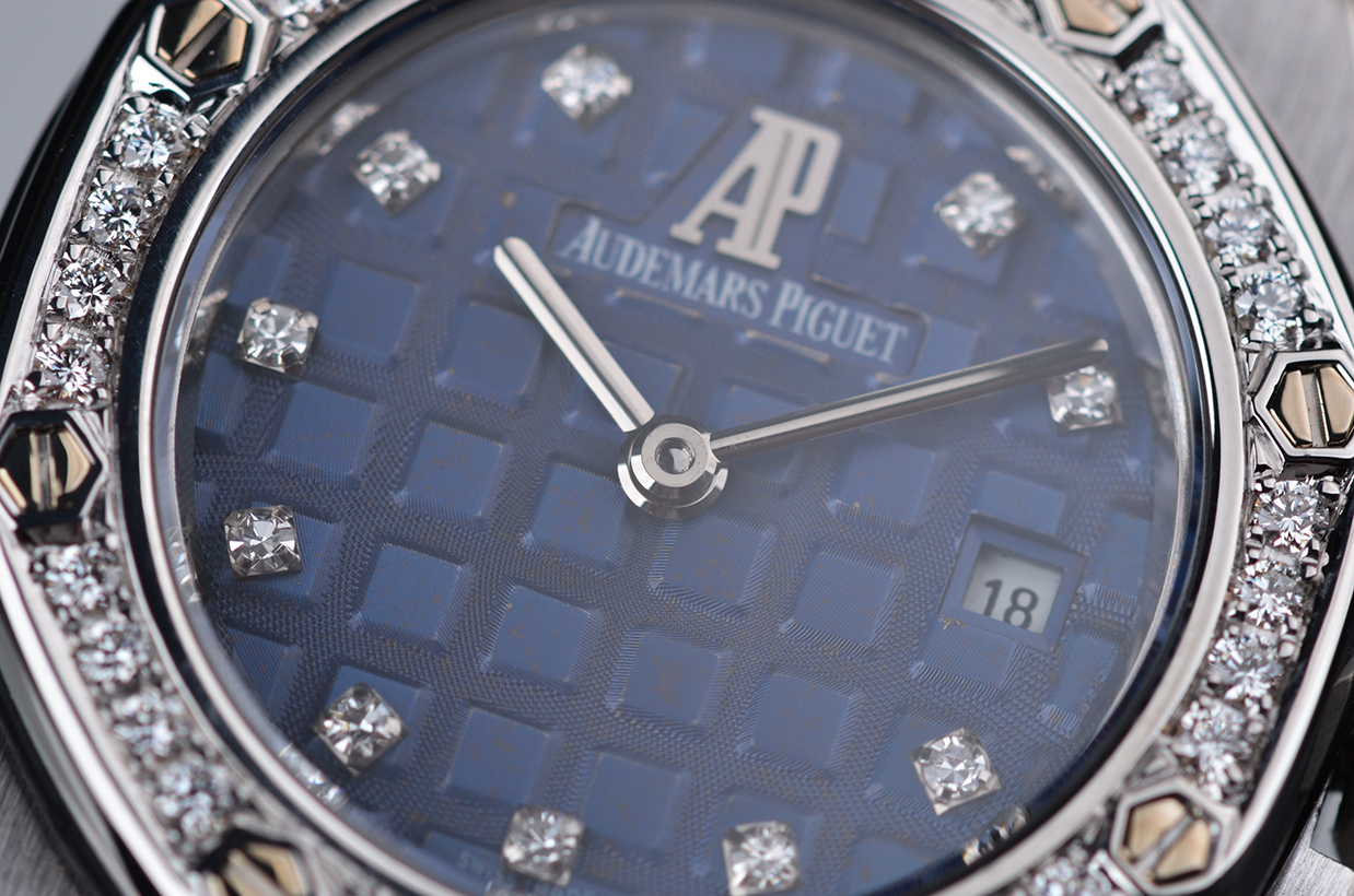 表盘:立体蓝色华夫格表盘,10颗原厂钻石时标,白金指针