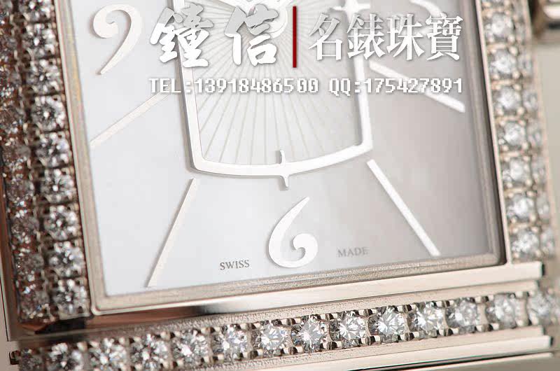 18K白金表壳及折叠式表扣,圣伯纳狗头印记。原厂白色鳄鱼皮表带成色极新。表框镶嵌四排原厂天然美钻,表冠亦镶嵌一颗大钻,共计93颗,约1.02克拉。白金指针及刻度,立体白色珍珠贝母表盘。口径40MM*24MM*7.9MM。相当于圆表36MM左右大小。防水30M。