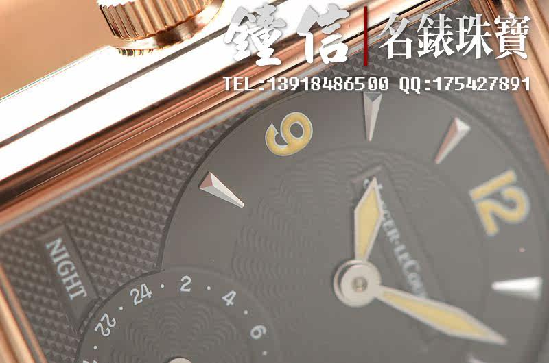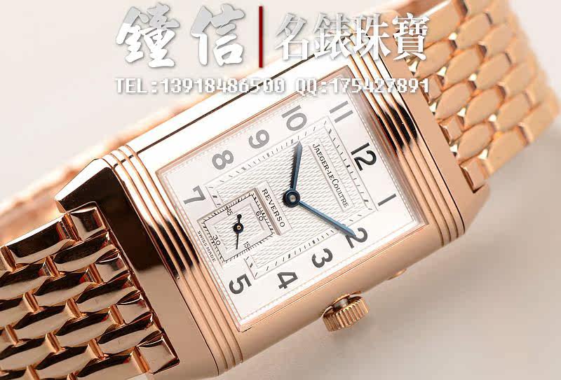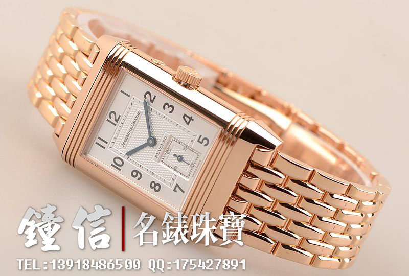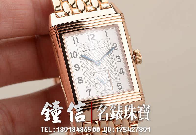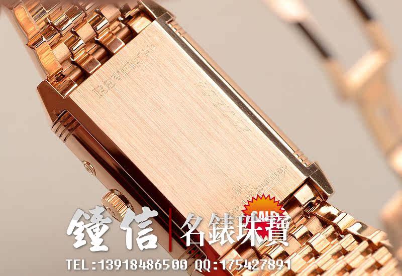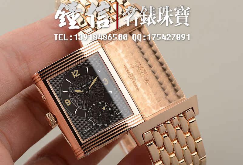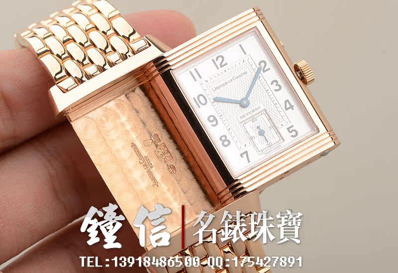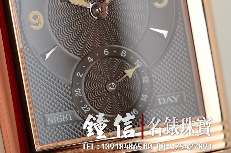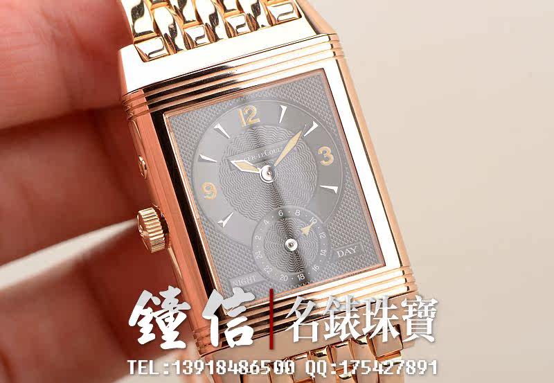 18K玫瑰金翻转表壳及链带,18K玫瑰金双向按压式折叠表扣。蓝宝石水晶镜面,立体银白,深灰双色表盘,正面蓝钢小三针,反面荧光针GMT第二时区及昼夜显示功能。口径42MM*26MM*9.7MM。相当于圆表37MM左右大小。按现在的戴表定义,女士完全可以佩戴。贵气优雅。防水30M。