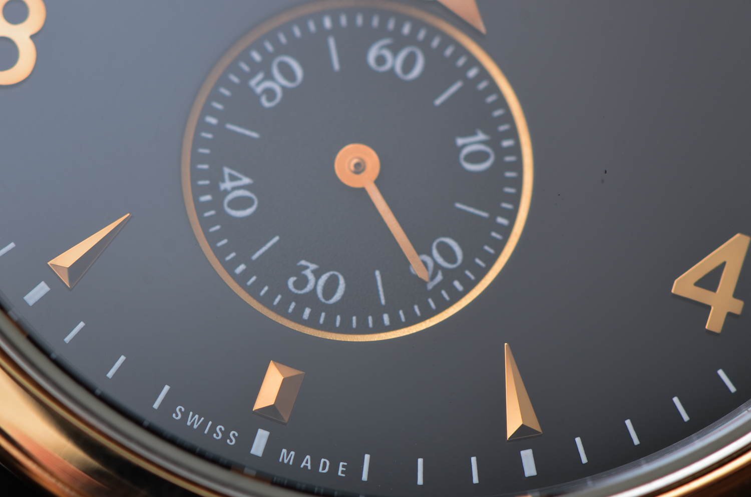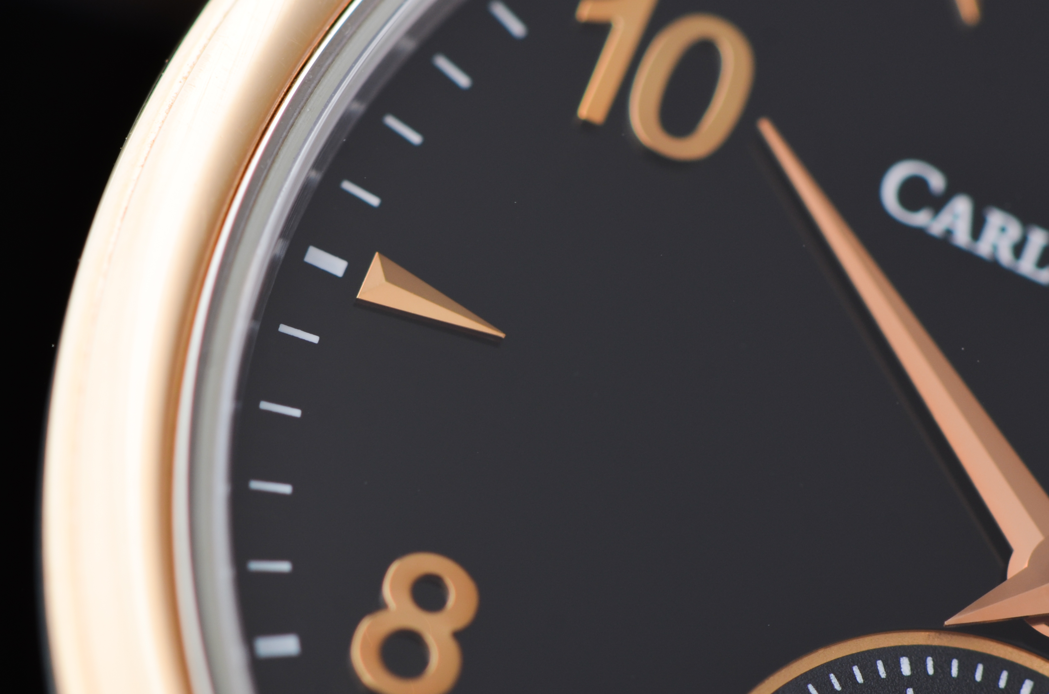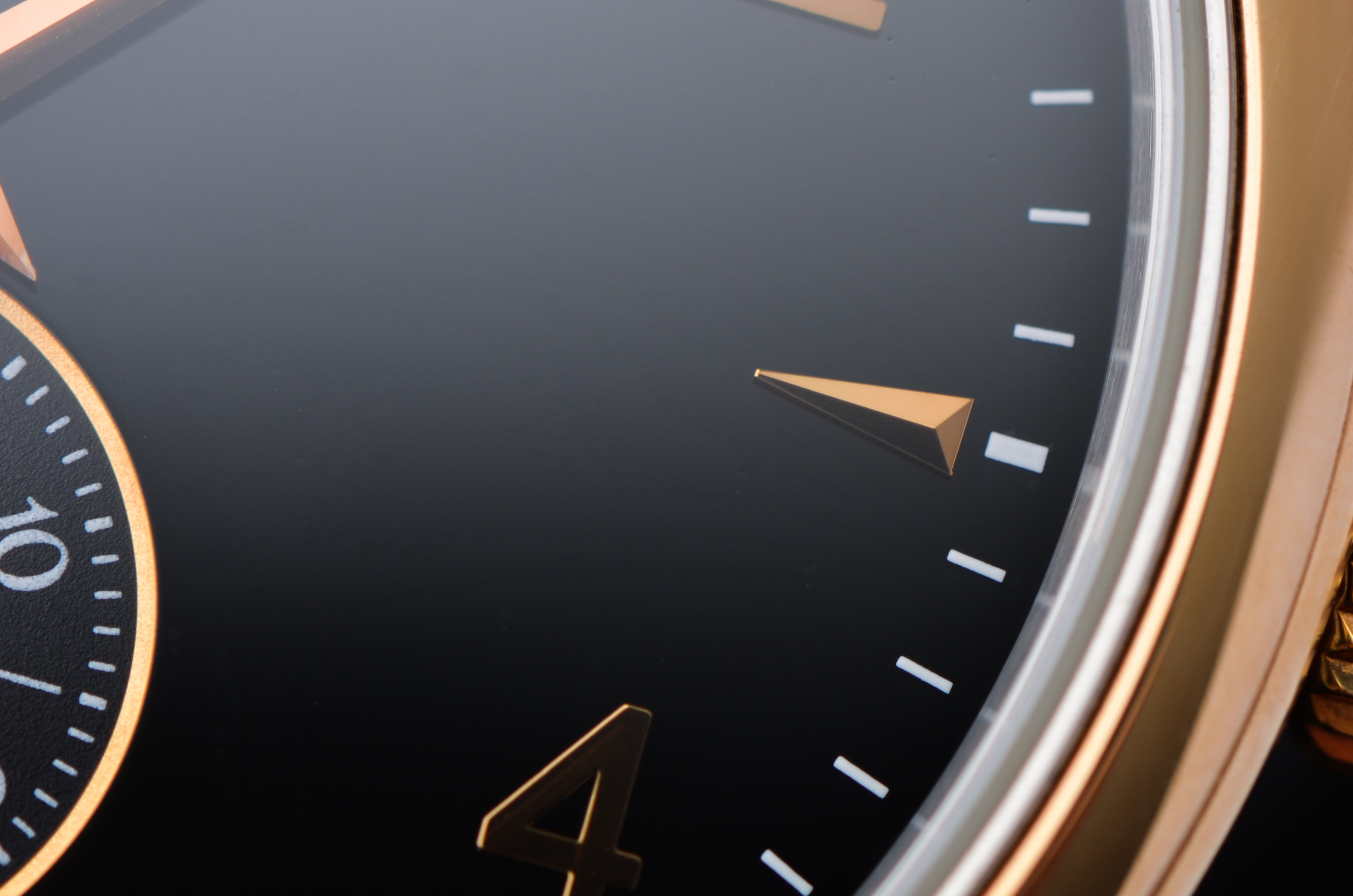 表盘:立体黑色表盘,玫瑰金阿拉伯数字时标及指针