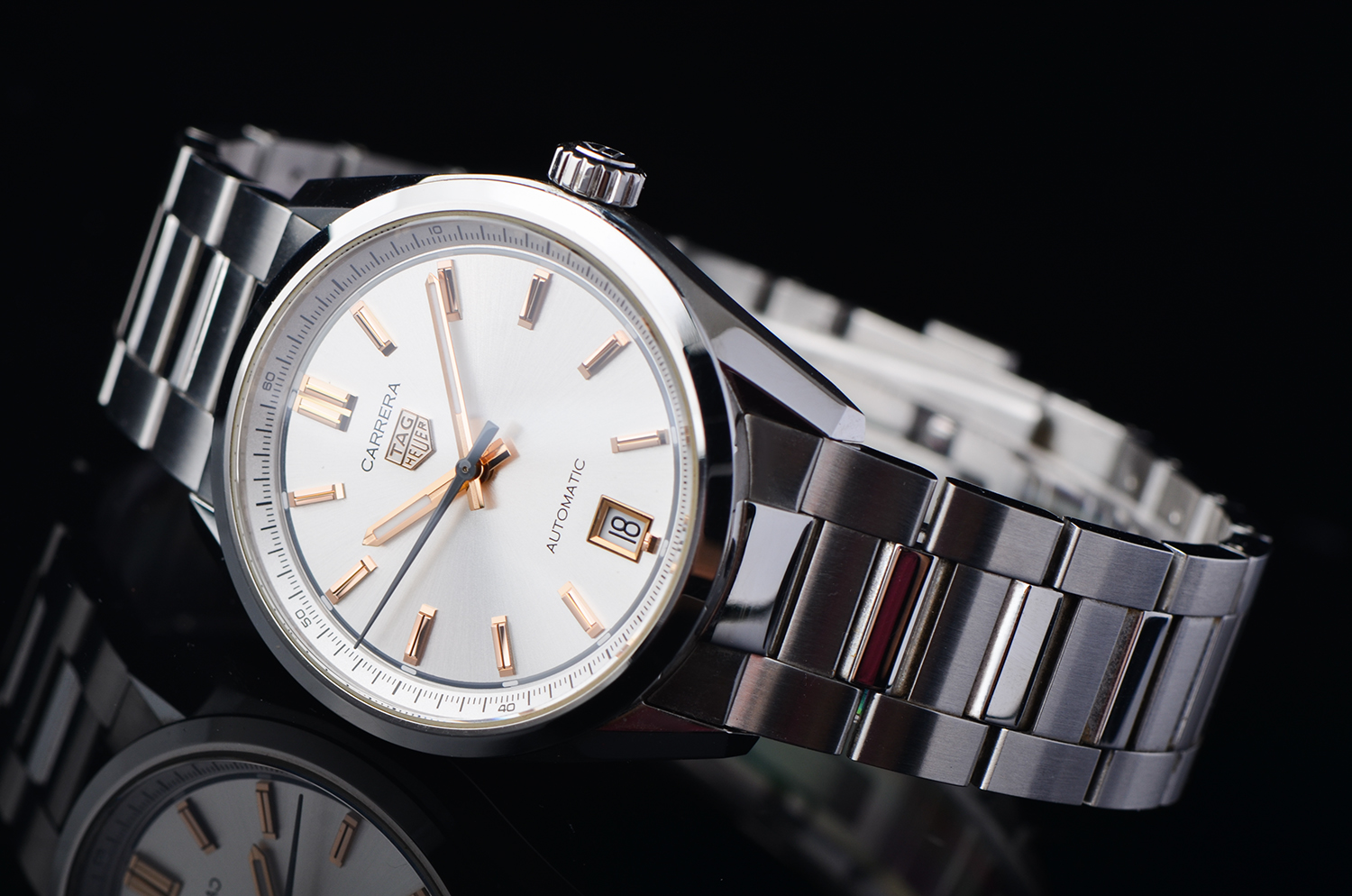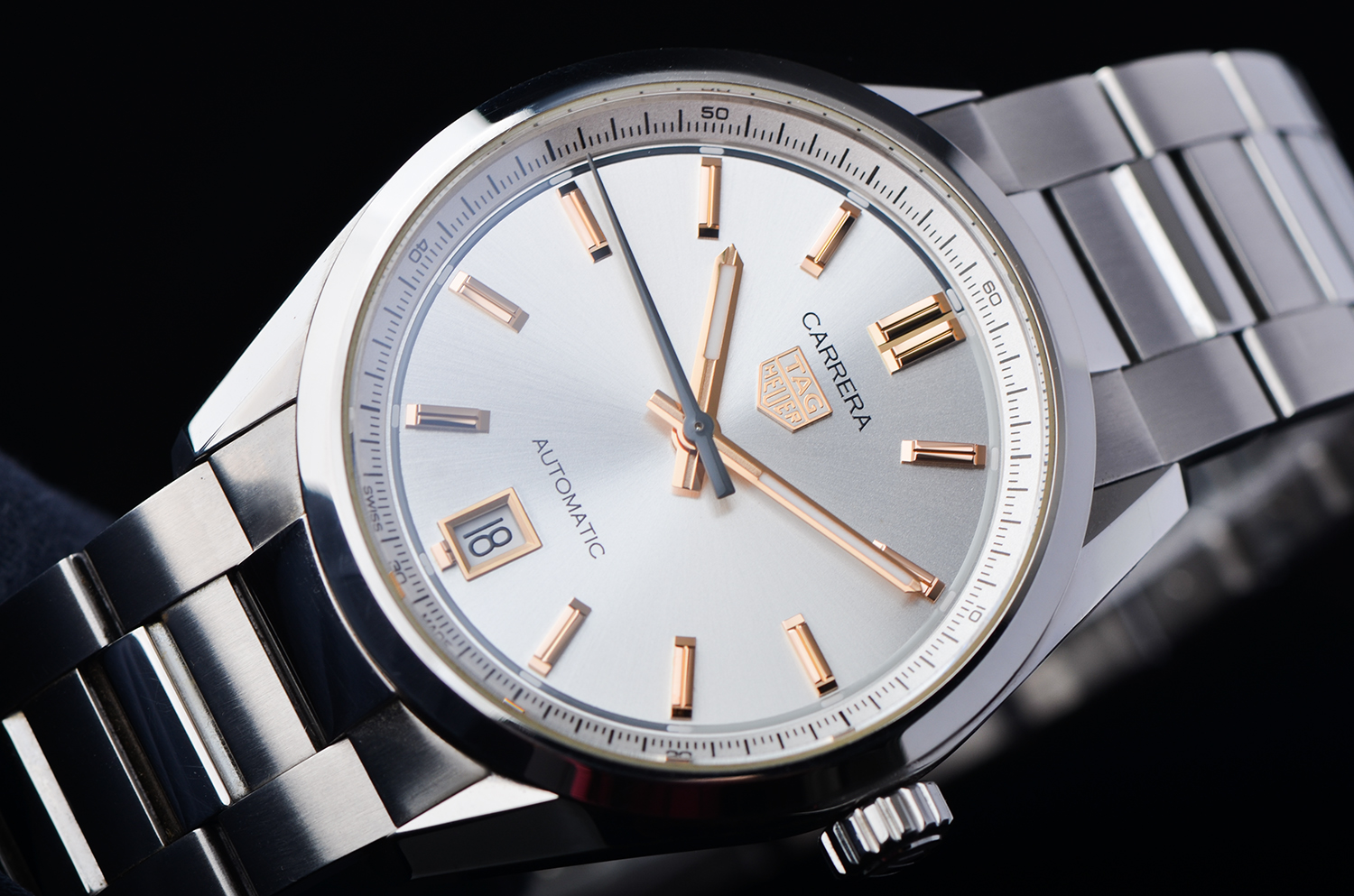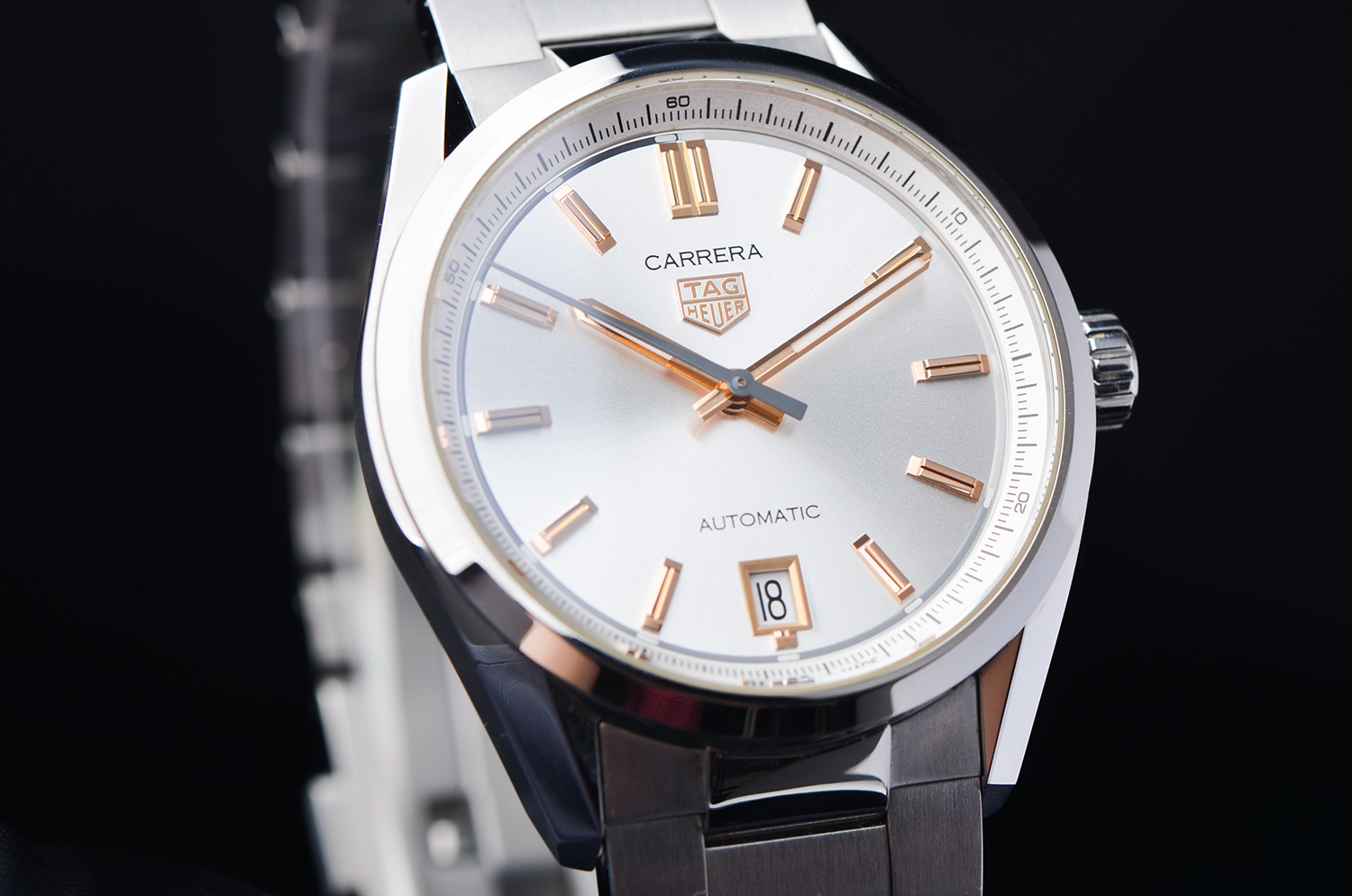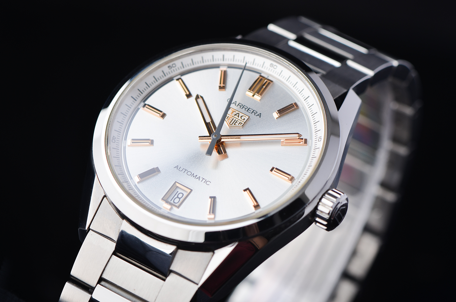 这款 Carrera Date 以 36 毫米精钢表壳诠释经典,银色太阳纹表盘搭配玫瑰金色指针与刻度,低调中透出温润奢华气息。