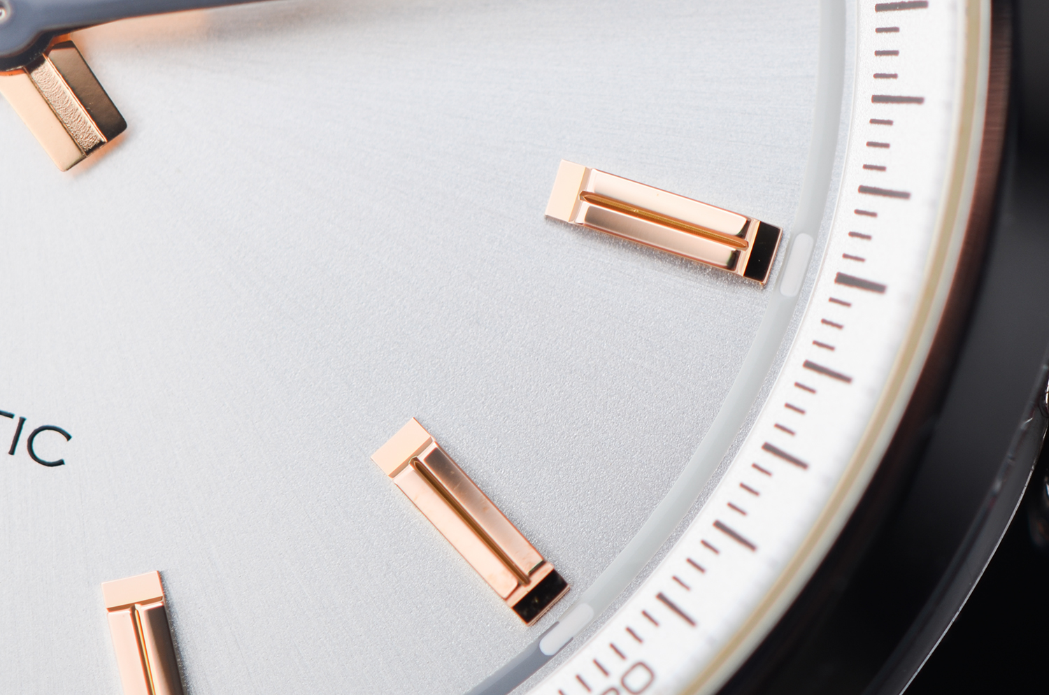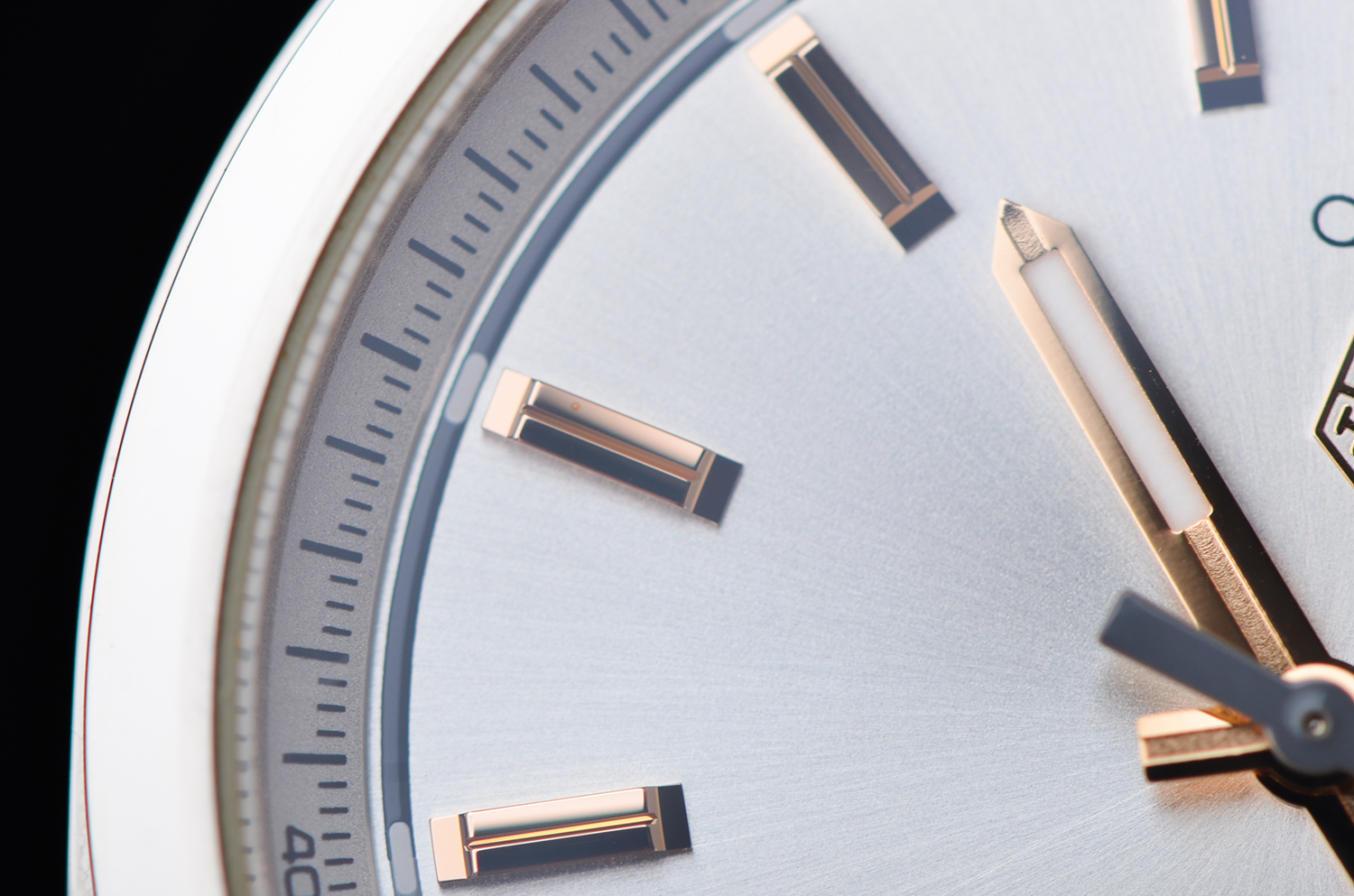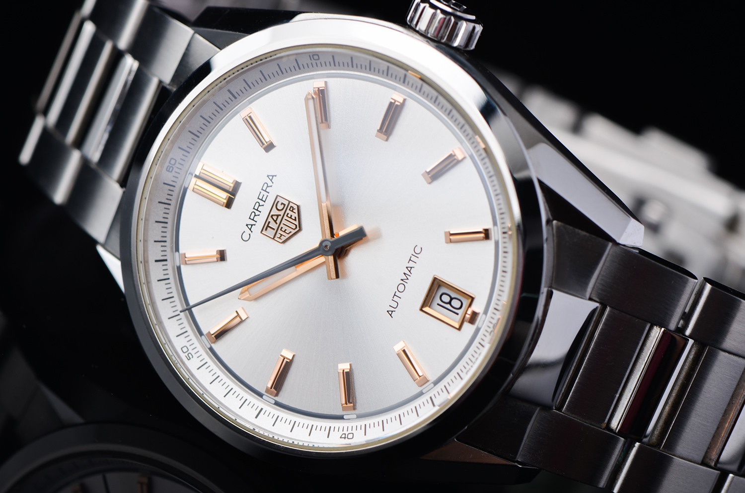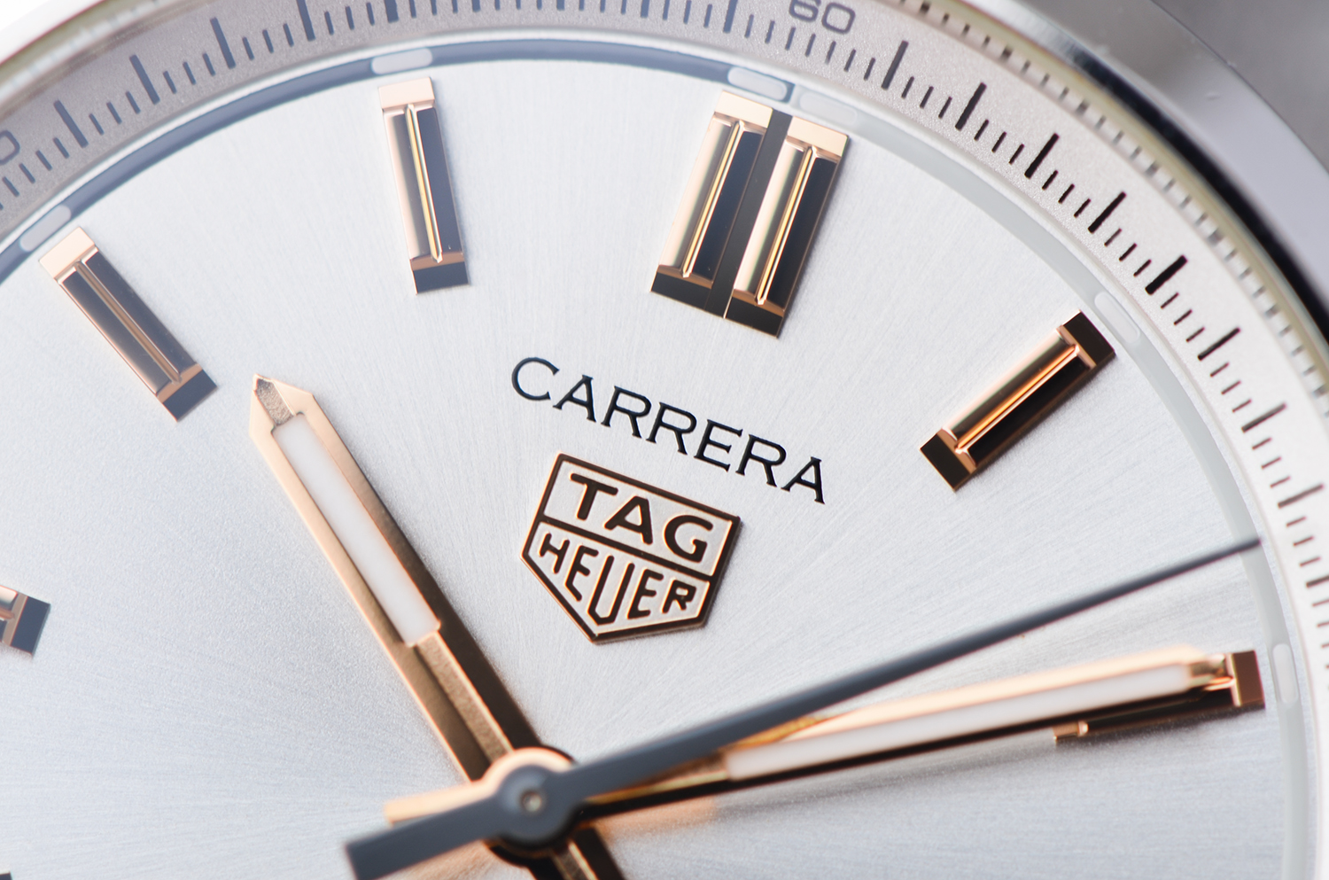 这款 Carrera Date 以 36 毫米精钢表壳诠释经典,银色太阳纹表盘搭配玫瑰金色指针与刻度,低调中透出温润奢华气息。