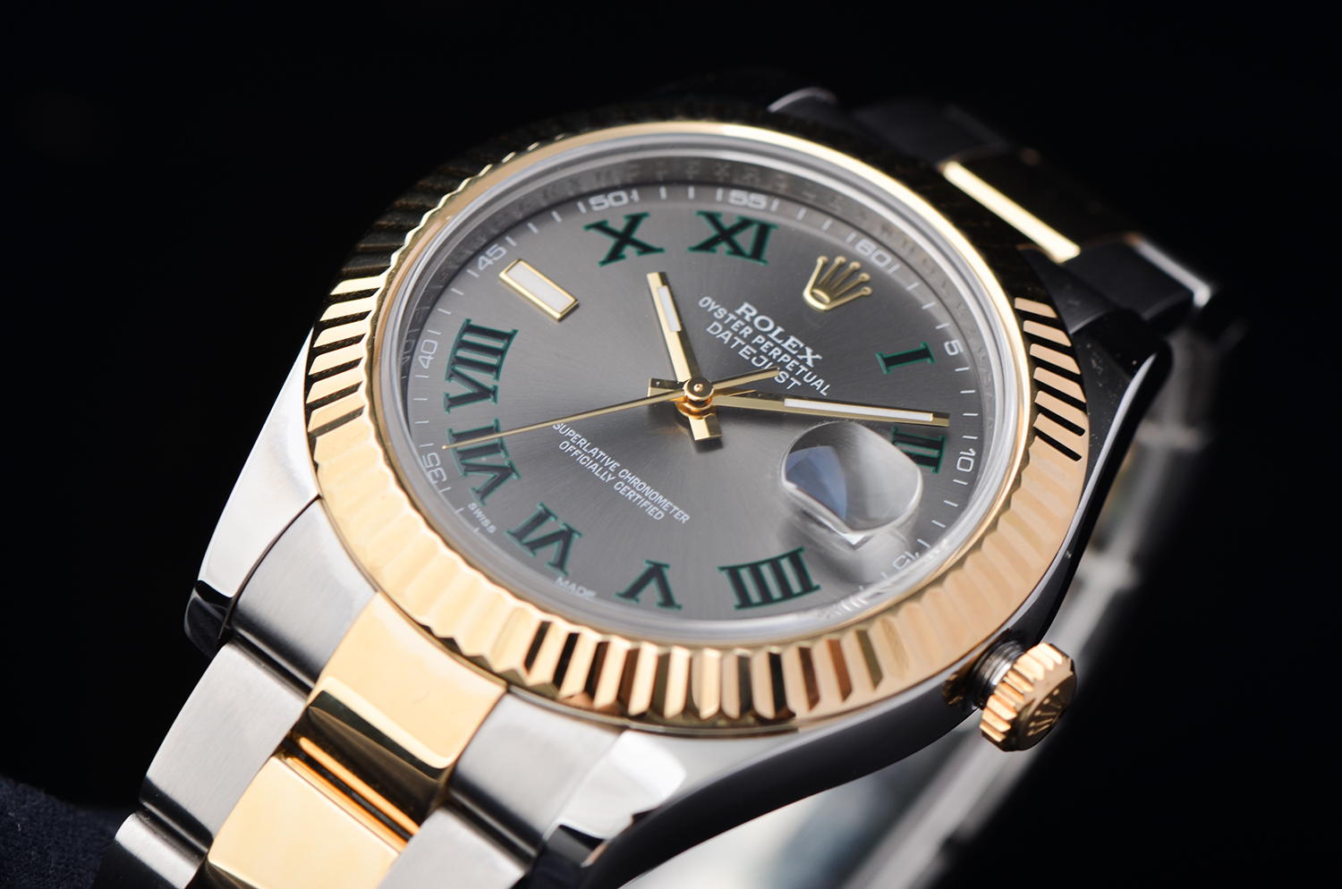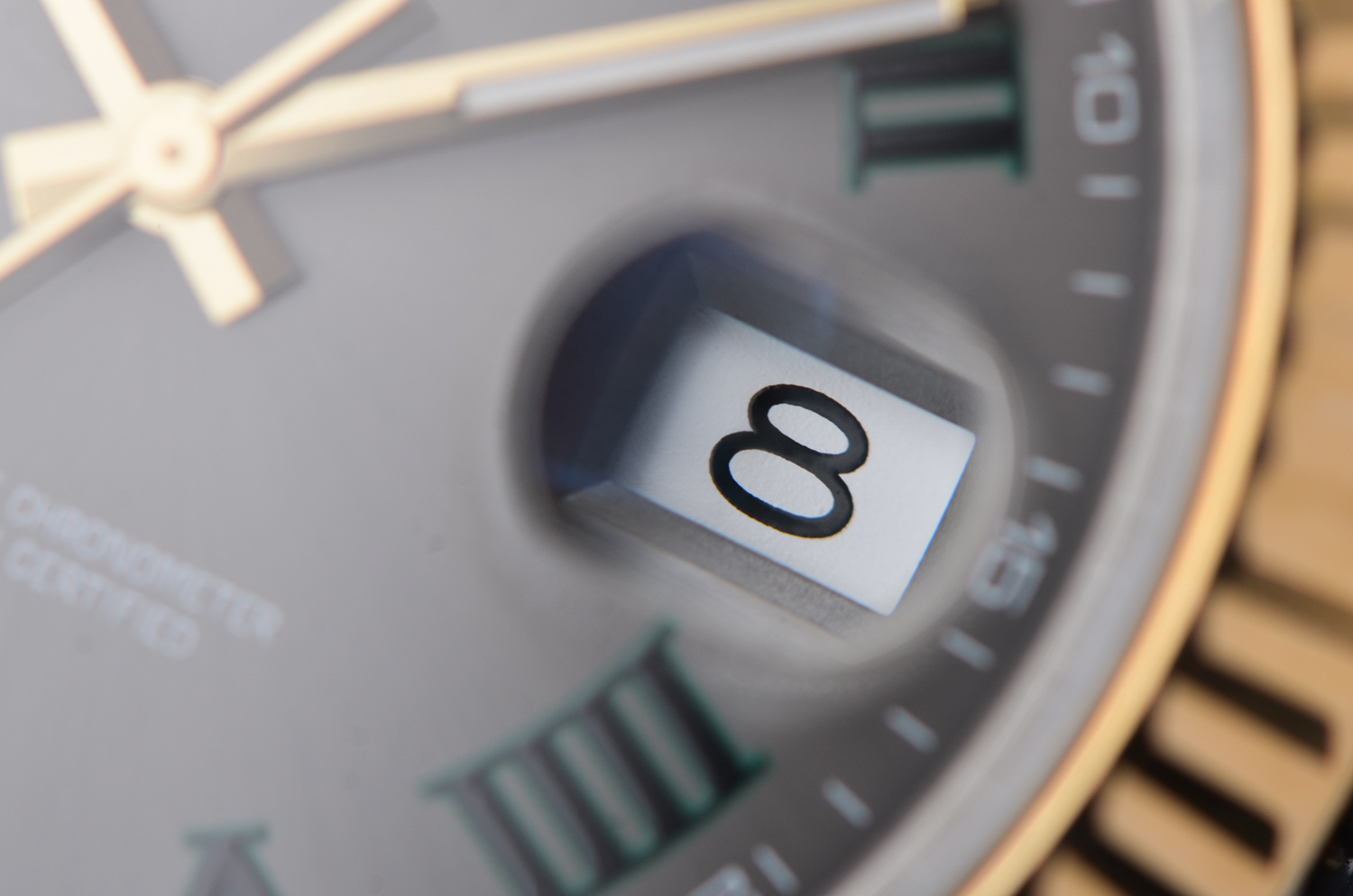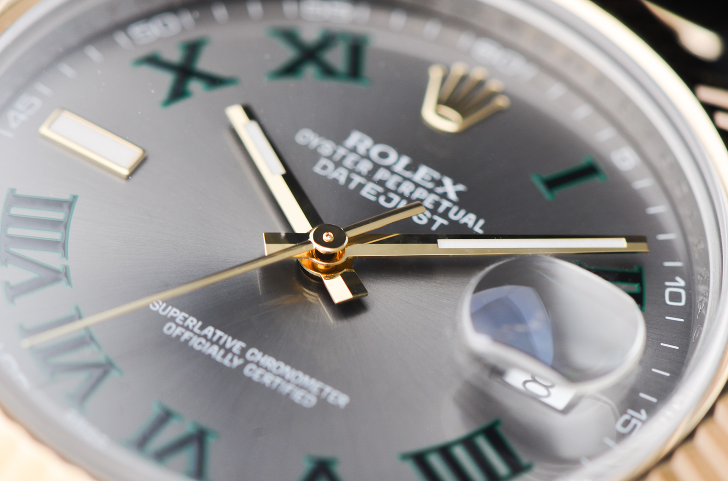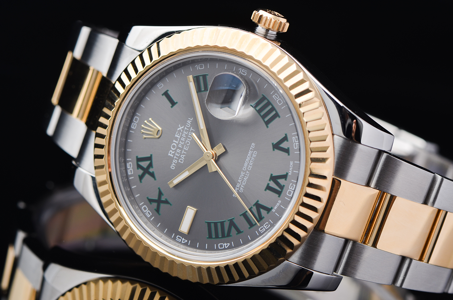 腕表采用 41mm 表径,大气而现代,搭配不锈钢与18K黄金双金属表壳,散发低调奢华的质感。经典的灰色表盘配以绿色罗马数字时标,与黄金时标边框相映成辉,3点位置设有日期窗口,并搭载劳力士标志性的 Cyclops 放大镜,读时清晰易辨。