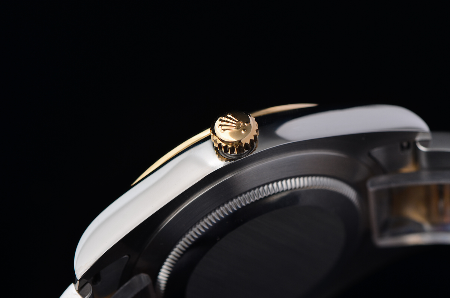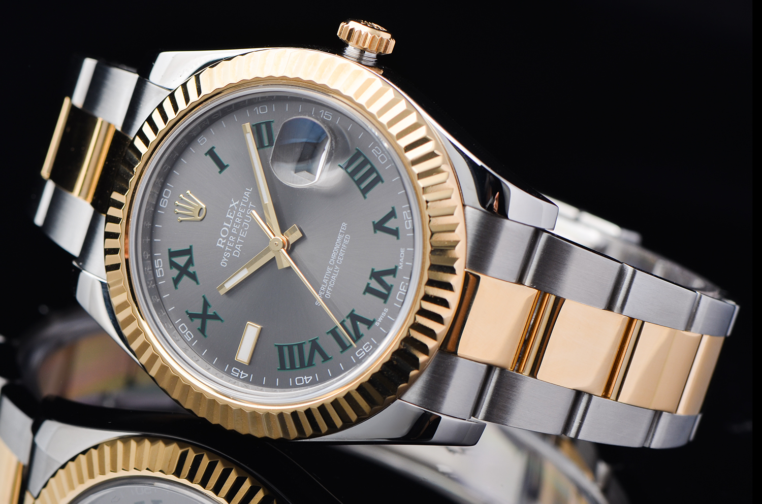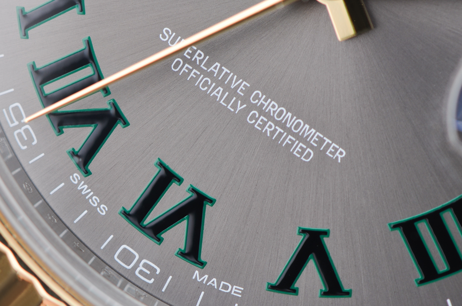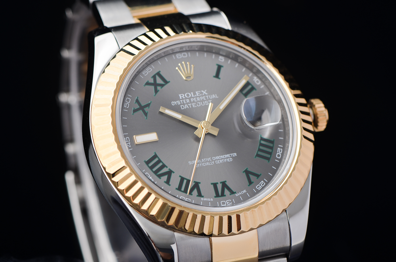 腕表采用 41mm 表径,大气而现代,搭配不锈钢与18K黄金双金属表壳,散发低调奢华的质感。经典的灰色表盘配以绿色罗马数字时标,与黄金时标边框相映成辉,3点位置设有日期窗口,并搭载劳力士标志性的 Cyclops 放大镜,读时清晰易辨。
